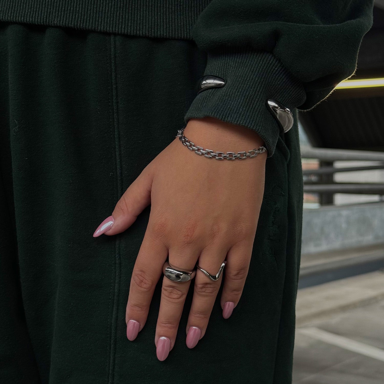 Armbåndets design er præget af en raffineret kæde, der giver det et moderne og sofistikeret udtryk. De glatte, polerede led reflekterer lyset smukt og tilføjer en subtil glans til dit look. Den sølvfarvede finish giver armbåndet en alsidighed, der gør det nemt at kombinere med andre smykker.