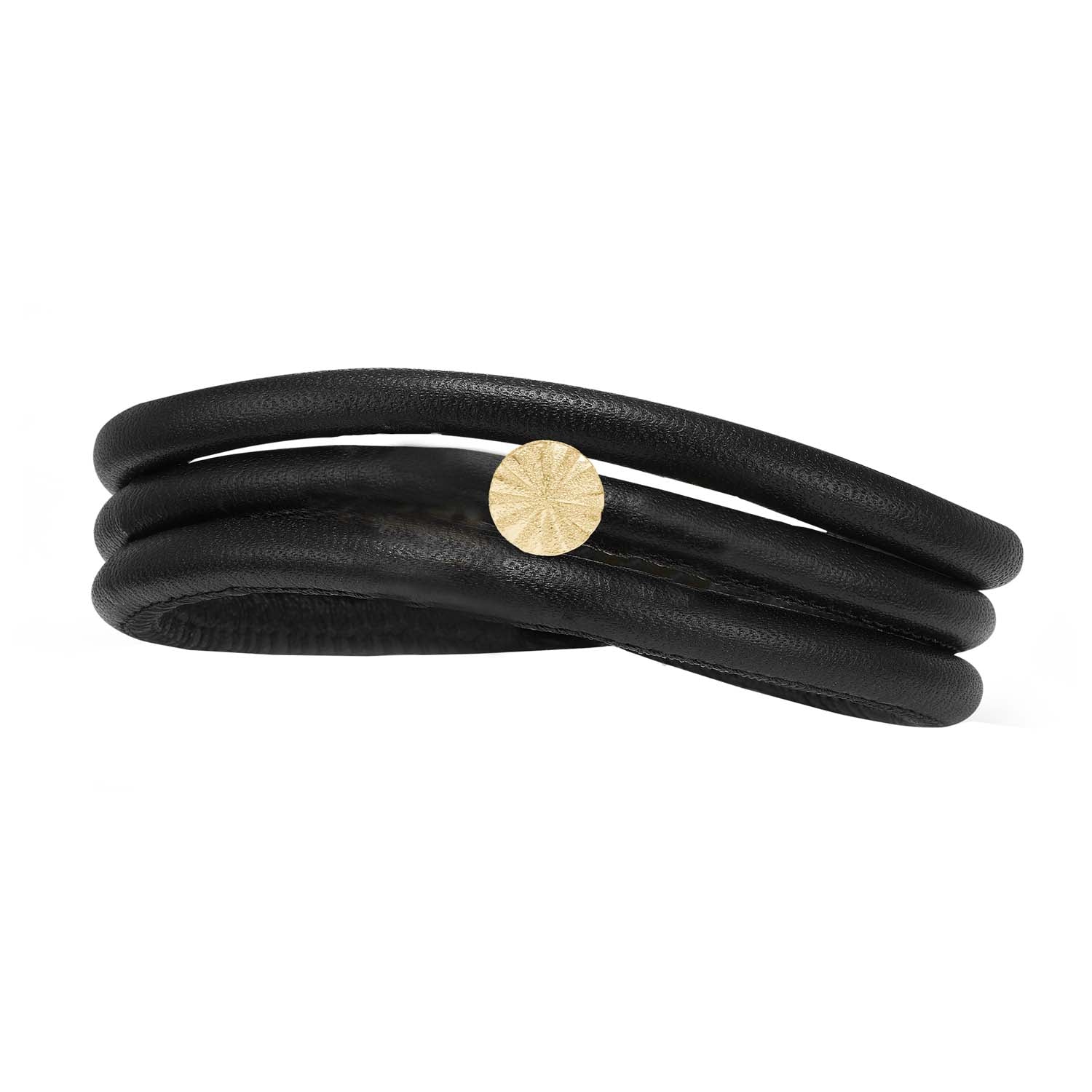 Dette armbånd er udført i sort læder, der smyger sig om håndleddet med en naturlig elegance. Den forgyldte sølvdetalje i midten tilføjer et subtilt, men iøjnefaldende element, der fanger lyset smukt. Den sorte farve giver en klassisk og alsidig stil, der kan bæres både til hverdag og fest.