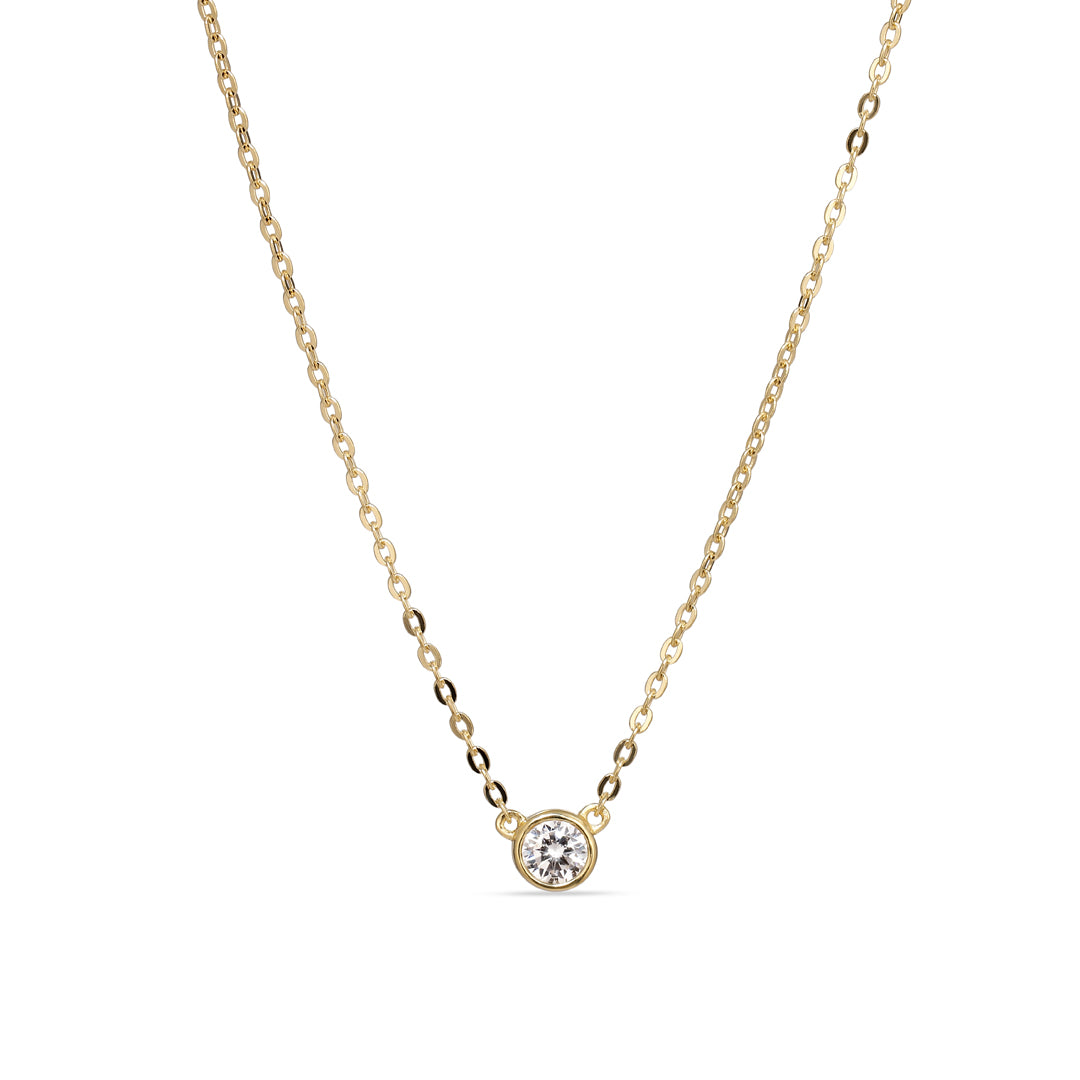 På billedet ses halskædens enkle, men sofistikerede design. Den gyldne farve skinner blidt og fremhæver den klare zirkonia, der er centralt placeret. Den subtile glans af guldet og den klare sten skaber en harmonisk balance, der gør halskæden til et alsidigt smykke.