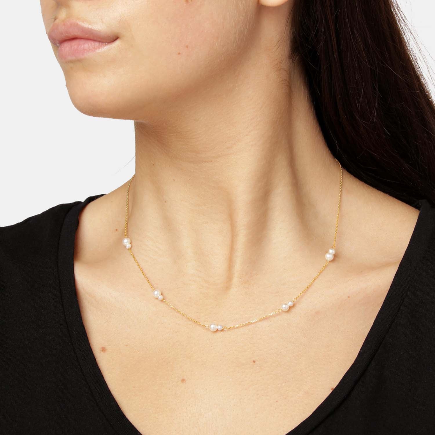 Halskæden præsenterer en delikat kæde i forgyldt guld, der smukt komplementerer de glatte, skinnende ferskvandsperler. Perlerne er strategisk placeret langs kæden for at skabe en harmonisk balance mellem elegance og enkelhed. Den gyldne nuance af kæden fremhæver perlernes naturlige glans, hvilket gør denne halskæde til et perfekt valg for både hverdag og særlige lejligheder.