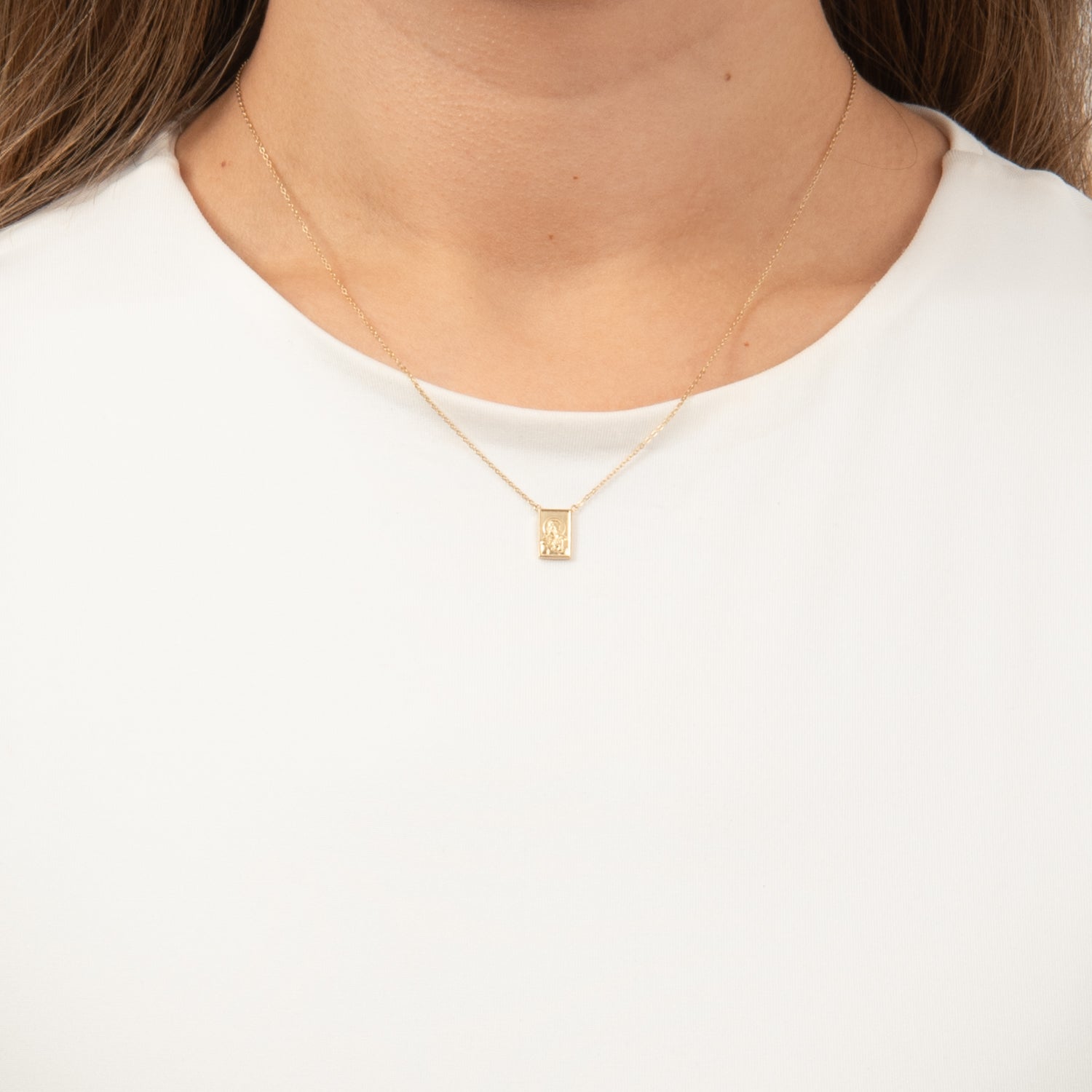 Halskæden har en smuk plade med et indgraveret motiv, der tilføjer en unik karakter. Den gyldne farve skinner blidt og fremhæver de fine detaljer i designet. Kæden er let og behagelig at bære, hvilket gør den ideel til både hverdag og særlige begivenheder.