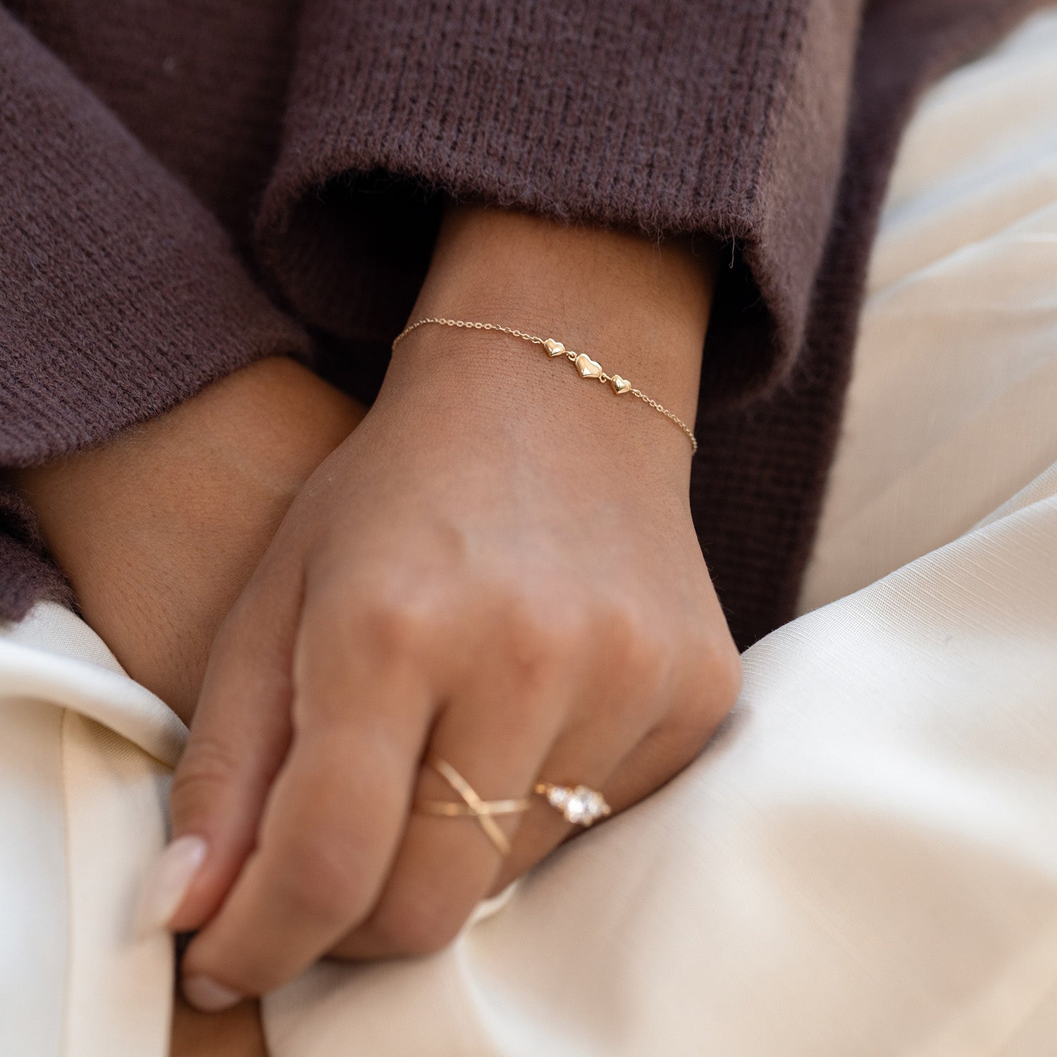 Armbåndet har en delikat kæde, der smyger sig om håndleddet og fremhæver de tre små hjerter i midten. Den gyldne farve skinner blidt i lyset og tilføjer et strejf af luksus til ethvert outfit. Den fine tekstur af guldet giver en glat og behagelig følelse mod huden, hvilket gør det ideelt til daglig brug.