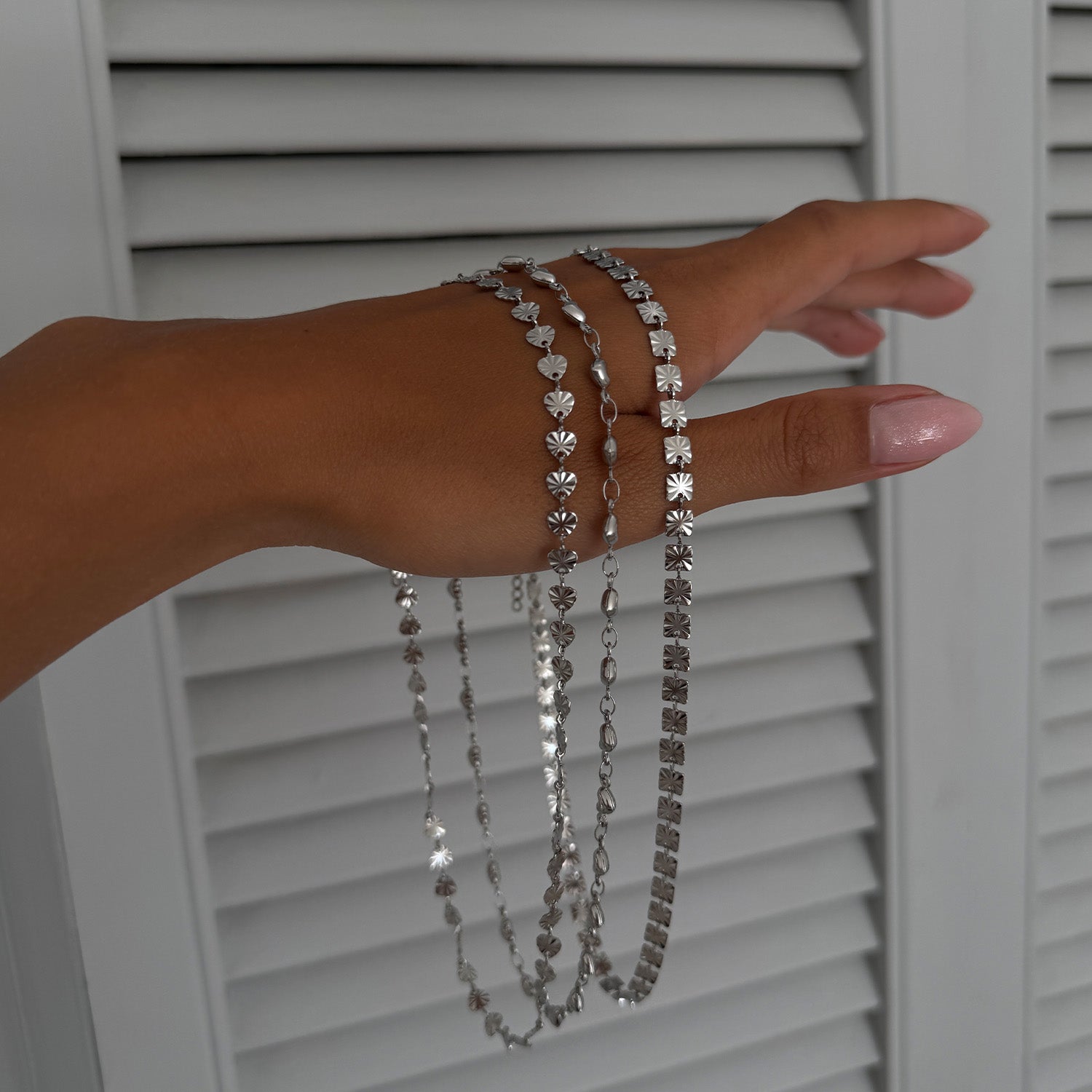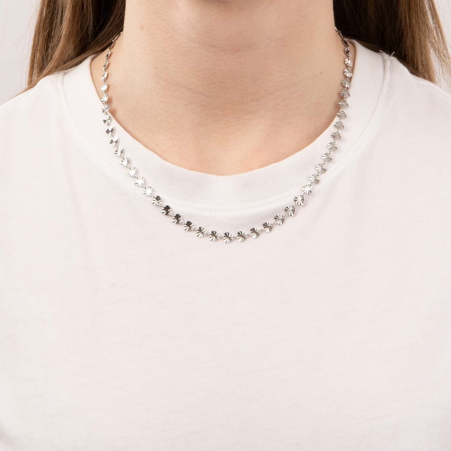 Halskæden er udført i et elegant stål, der giver et moderne og stilrent udtryk. De små trekantede elementer skaber en delikat tekstur, der fanger lyset smukt. Den sølvfarvede finish tilføjer en tidløs charme, der gør den velegnet til både hverdag og særlige lejligheder.