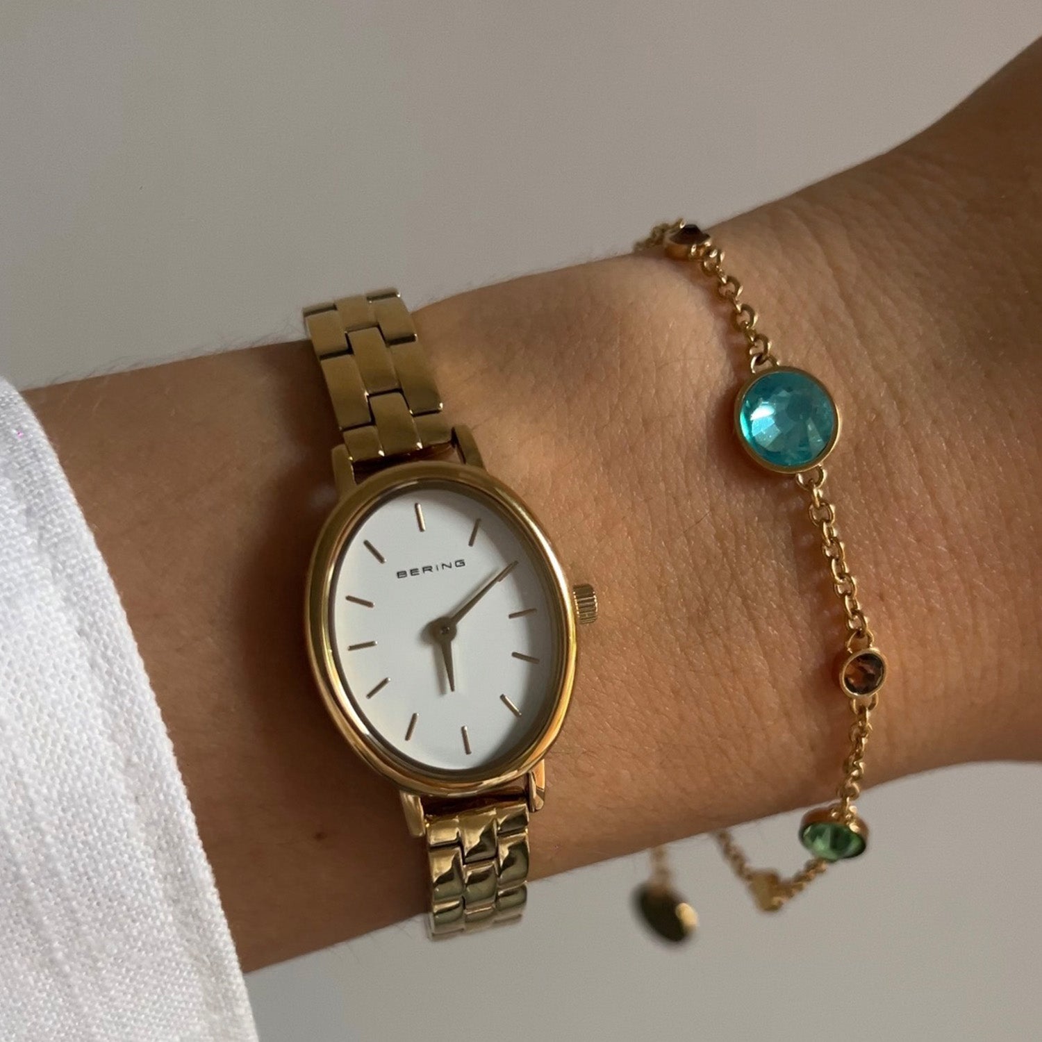 Oplev elegance og farvespil med dette smukke armbånd fra Bering. Fremstillet i forgyldt stål, kombinerer det tidløs skønhed med moderne design. Perfekt til kvinden, der ønsker at tilføje et strejf af farve til sin stil.