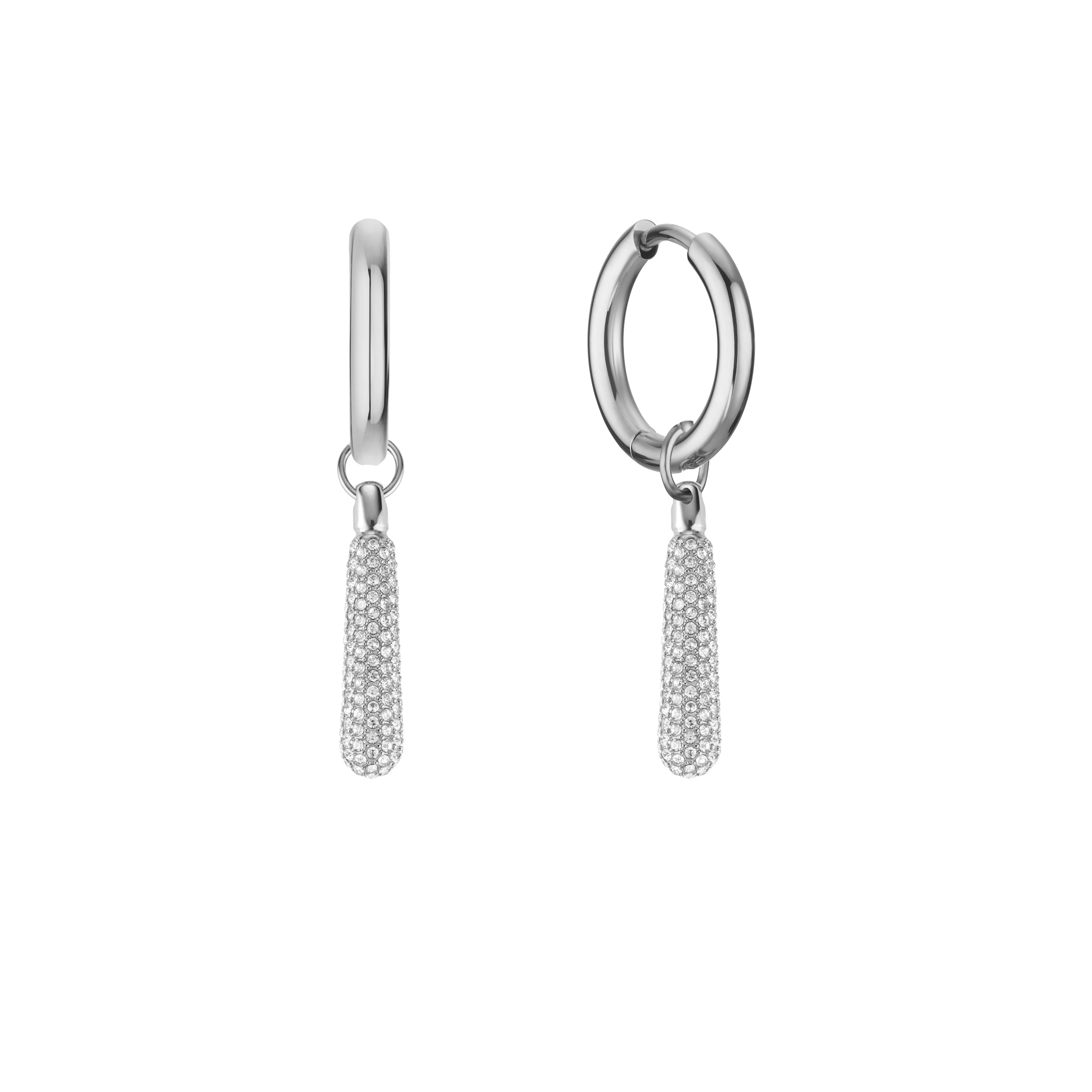 Øreringene har en længde på 34,6 mm, hvilket giver dem en markant, men stadig elegant tilstedeværelse. Den glatte overflade i rustfrit stål reflekterer lyset smukt og fremhæver de fine detaljer i designet. Den pavé-inspirerede struktur tilføjer en ekstra dimension af raffinement, der fanger øjet og skaber en sofistikeret glød.