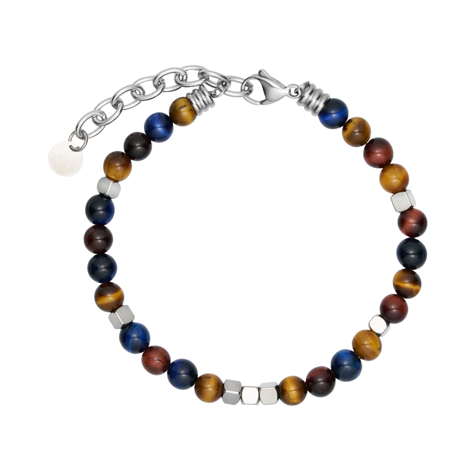 Opdag det maskuline armbånd fra MAEND, der kombinerer rå styrke med naturlig elegance. Dette unikke smykke er sammensat af blå og brune tigerøje sten, der er kendt for deres dybde og spil i farverne, hvilket giver hvert armbånd sit eget unikke udtryk. De skinnende stålperler tilføjer et moderne touch og sikrer, at armbåndet står skarpt til enhver lejlighed.