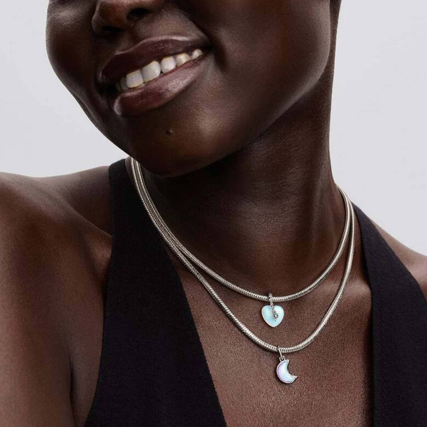 Med Pandora's Crescent Moon Double Dangle charm får du ikke blot et smykke, men et stykke kunst, der fortæller en historie. Lad denne charm blive en del af din personlige fortælling og bær den med stolthed.
