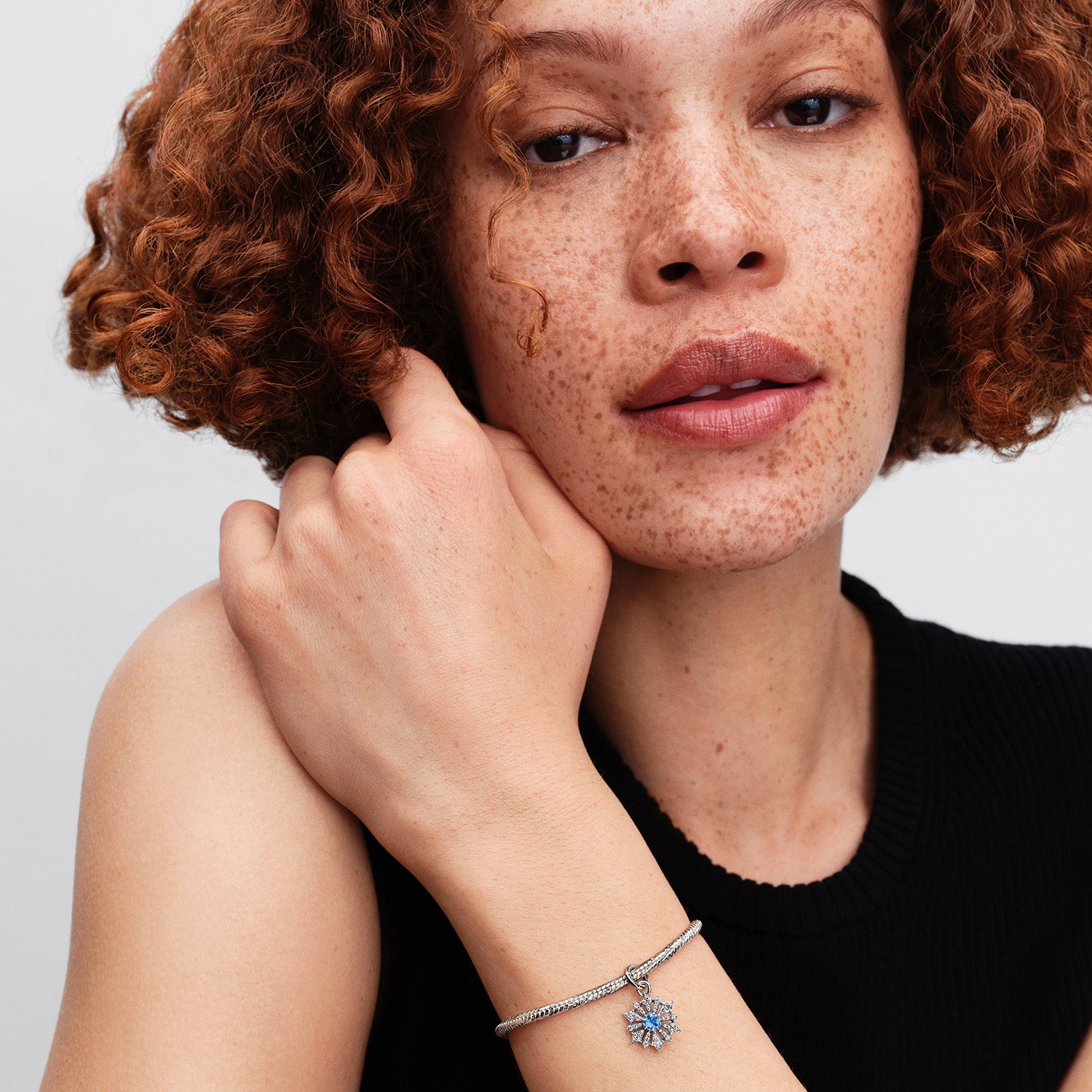 Den delikate charm er udført i skinnende sølv, der fanger lyset på smukkeste vis. Den blå sten i midten tilføjer en subtil farvekontrast, der fremhæver snefnuggets detaljerede design. Med sin elegante form og glitrende overflade, er denne charm en perfekt tilføjelse til ethvert Pandora-armbånd.