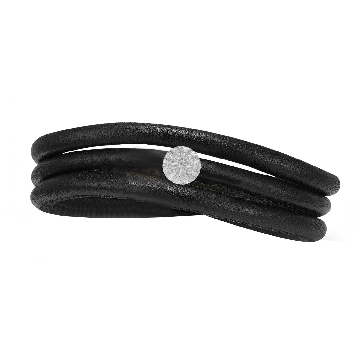 Dette armbånd er udført i sort læder, der giver en sofistikeret og alsidig stil. Den sølvfarvede detalje tilføjer et strejf af luksus, mens den bløde lædertekstur sikrer komfort hele dagen. Armbåndet vikles elegant om håndleddet, hvilket giver et moderne og stilfuldt udtryk.
