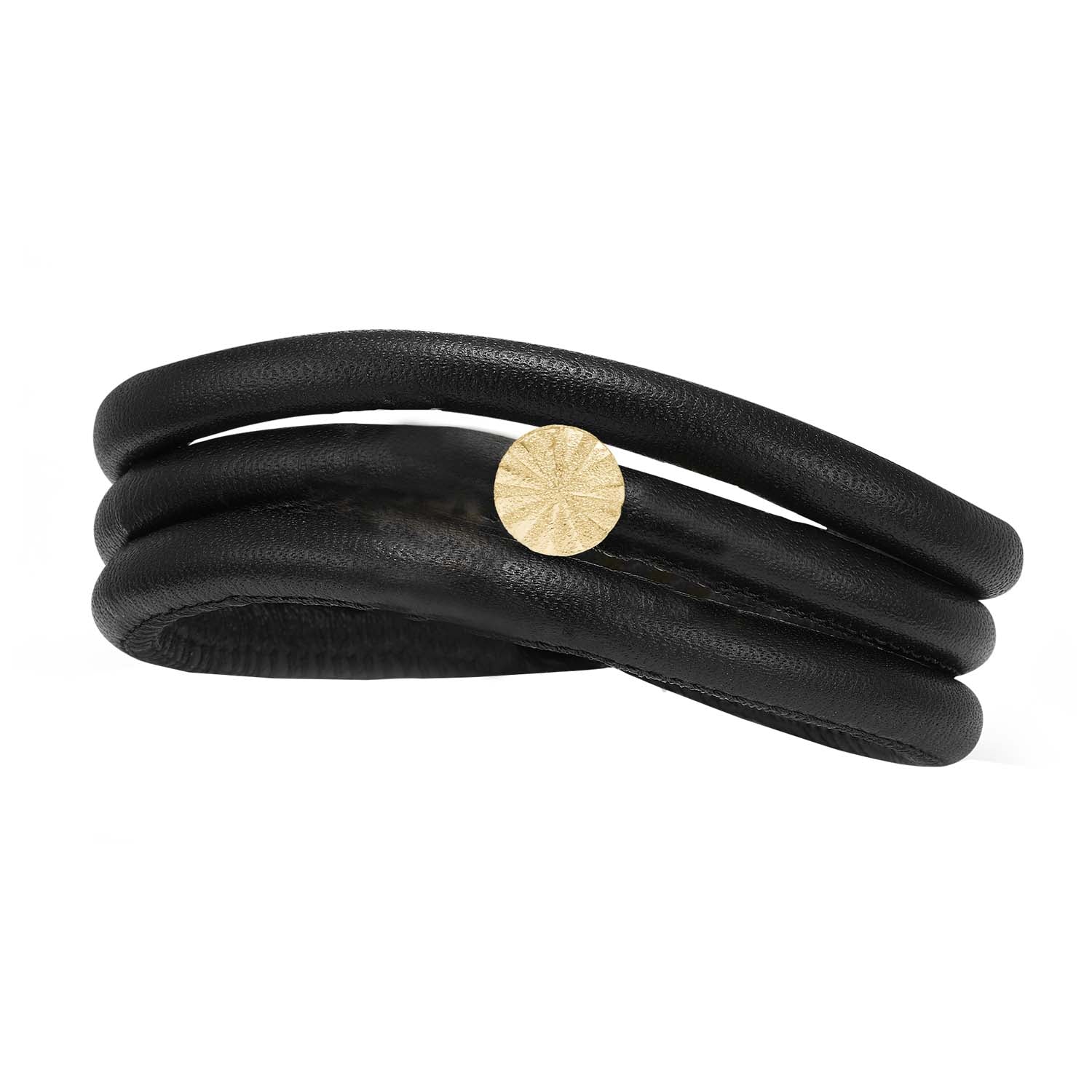 Armbåndet er udført i sort læder, der smyger sig om håndleddet med en blød og fleksibel følelse. Den forgyldte sølvdetalje skaber en smuk kontrast til det sorte læder og tilføjer et strejf af elegance. Det minimalistiske design gør det nemt at kombinere med andre smykker, mens den gyldne detalje fanger lyset og tiltrækker opmærksomhed.