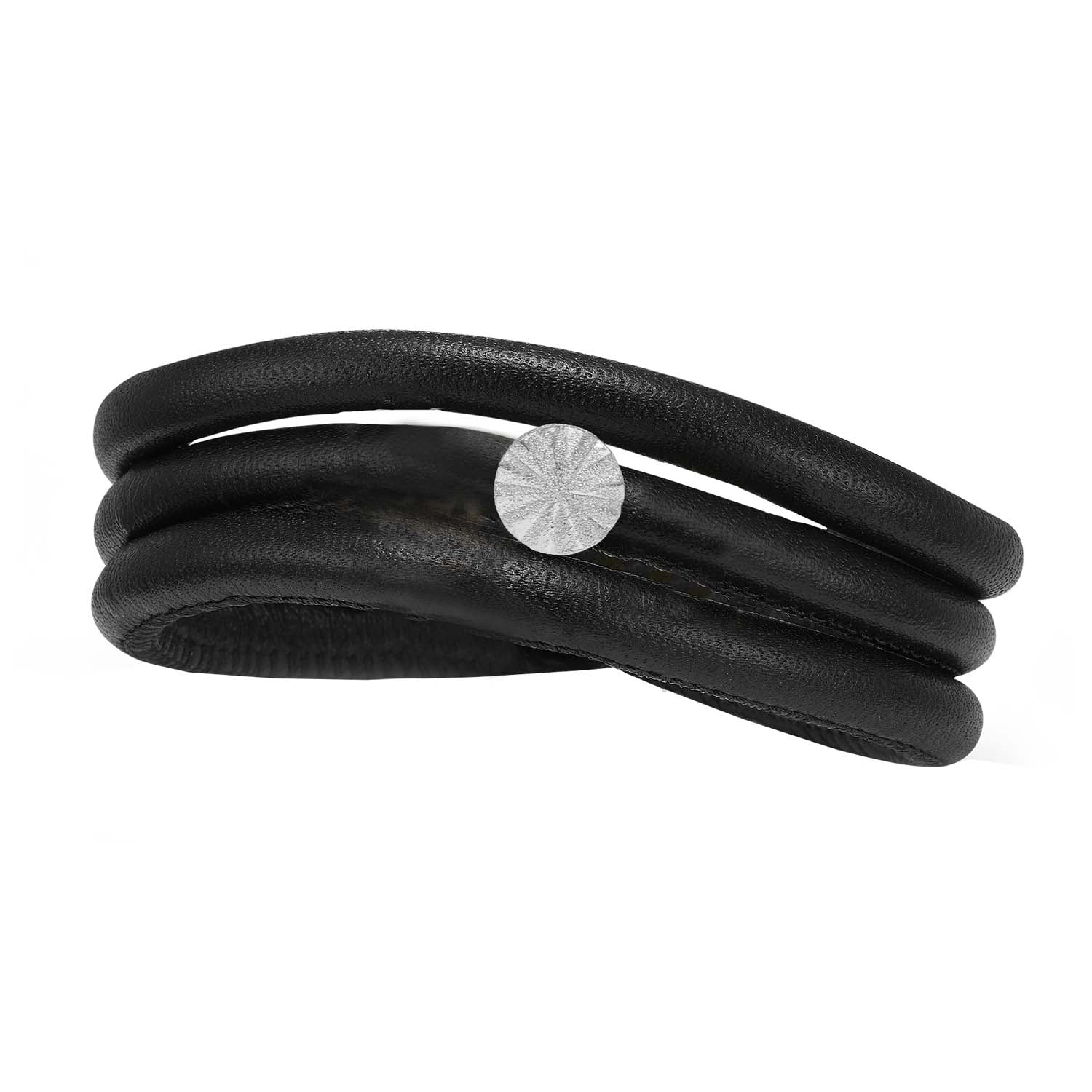 Dette armbånd er udført i sort læder, der giver en sofistikeret og tidløs appel. Den sølvfarvede detalje tilføjer et strejf af luksus, mens den bløde tekstur sikrer komfort hele dagen. Armbåndet er designet med en enkel, men stilfuld lukning, der gør det nemt at tage af og på.