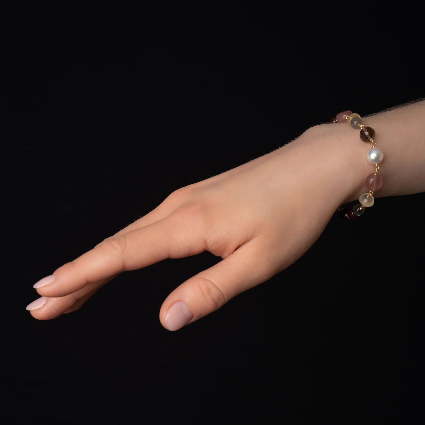 De delikate akoya perler og ædelstenene er omhyggeligt udvalgt for deres skønhed og kvalitet, hvilket gør hvert armbånd unikt. Den subtile glans fra perlerne og de varme toner fra guldet skaber en harmonisk balance, der fremhæver armbåndets raffinerede design.