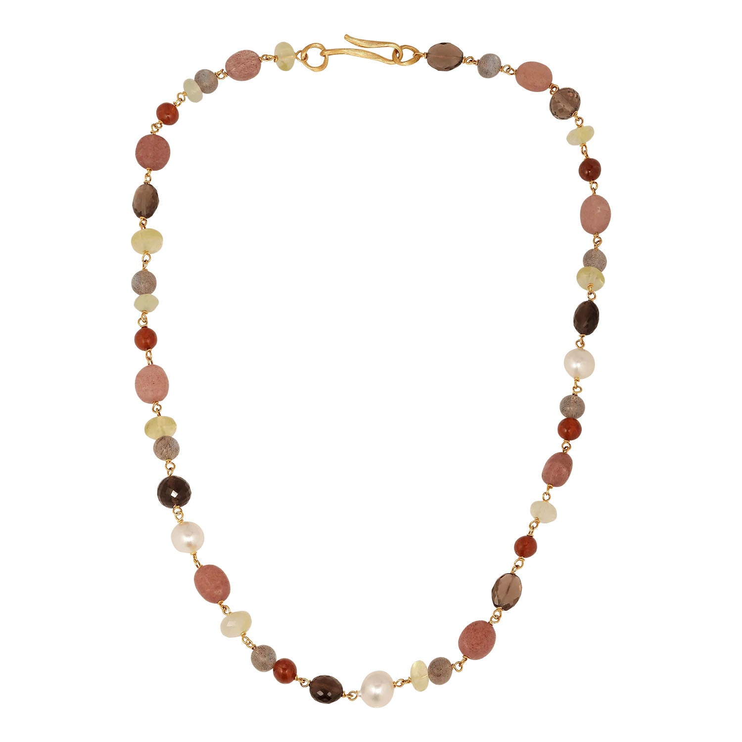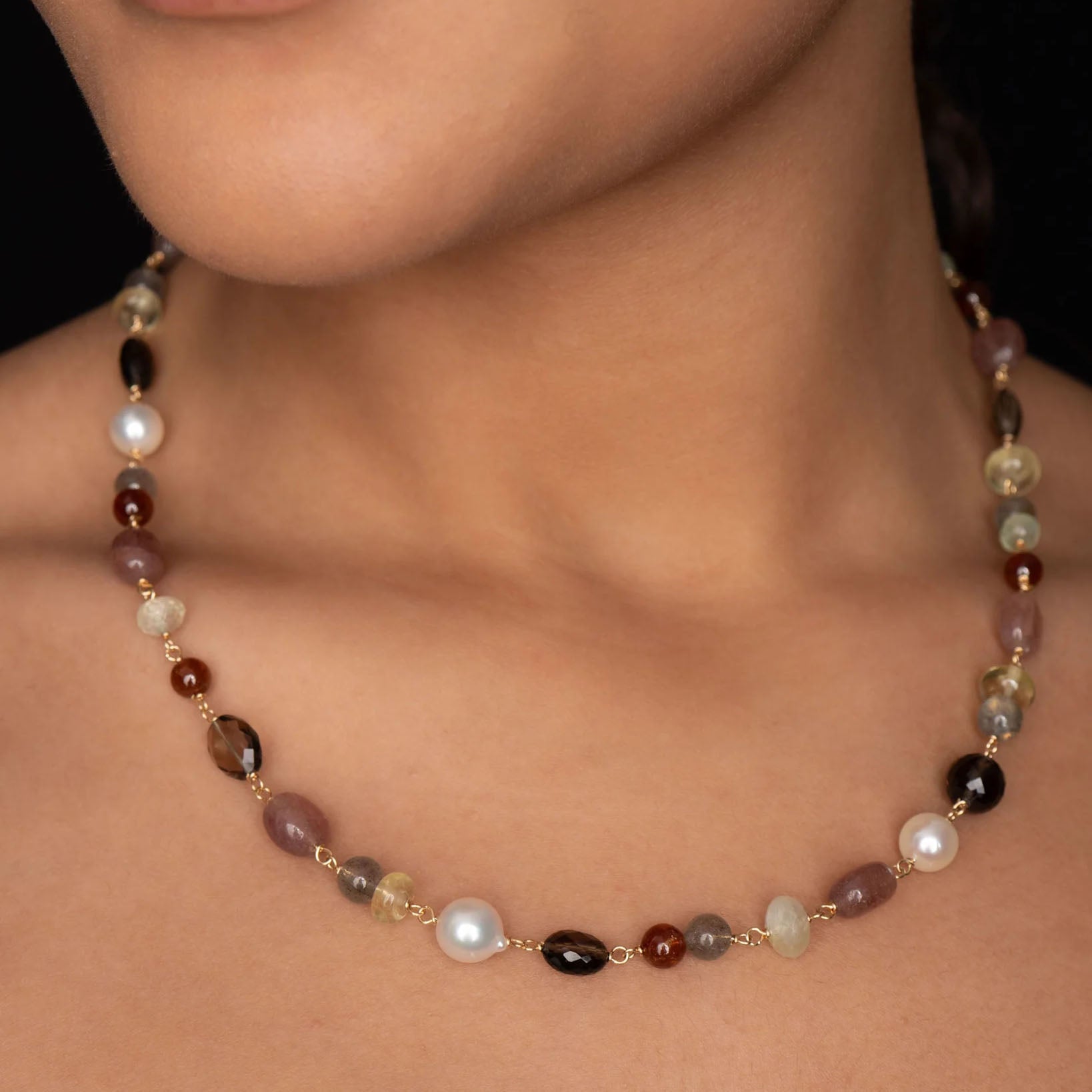 Halskæden fremstår med en harmonisk blanding af hvid, perlemor, gul og brun, der skaber en varm og indbydende farvepalet. De glatte akoya perler og de polerede ædelsten giver en behagelig tekstur, der føles let og elegant mod huden.