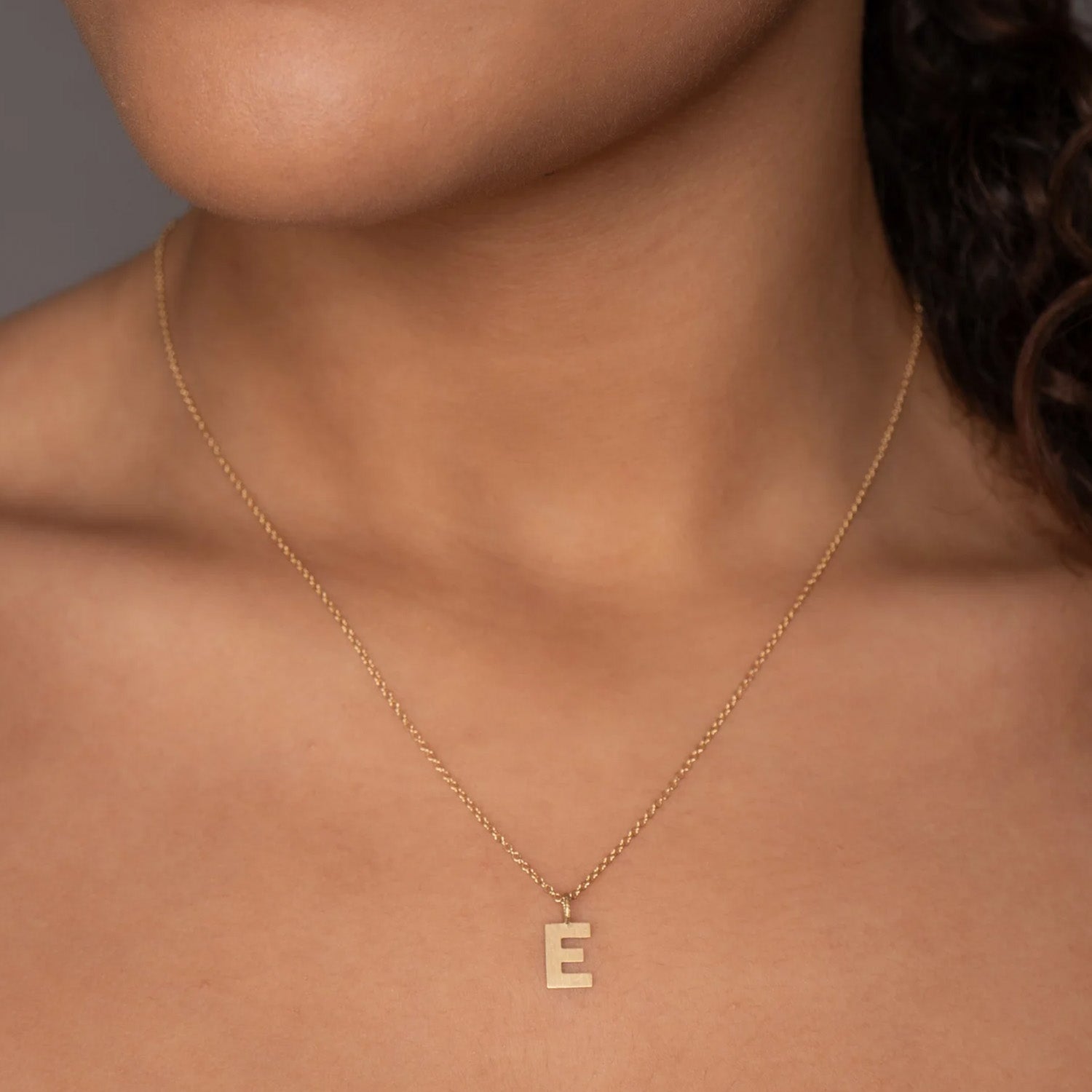 Vedhænget er formet som bogstavet "E" og udstråler en subtil elegance. Den matte overflade giver en blød tekstur, der føles behagelig mod huden. Den gyldne farve skinner med en varm glød, der fanger lyset smukt. Det enkle, men sofistikerede design gør det nemt at kombinere med andre smykker, hvilket giver dig mulighed for at skabe et unikt look.