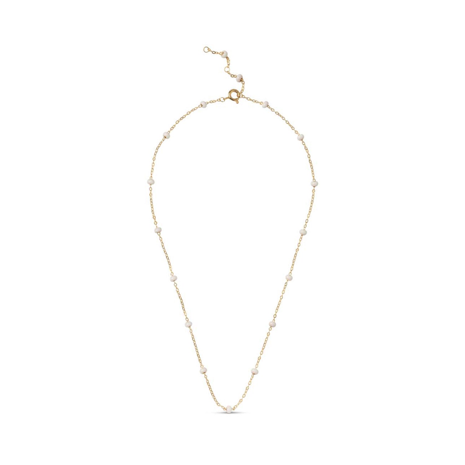 Halskæden er udsmykket med delikate perler, der er jævnt fordelt langs den fine kæde. Den gyldne nuance af det forgyldte sølv skaber en varm og indbydende glød, der komplementerer enhver hudtone. Med en længde på 38+2+2 cm kan du nemt justere halskæden til den ønskede længde, hvilket gør den alsidig til både hverdag og fest.