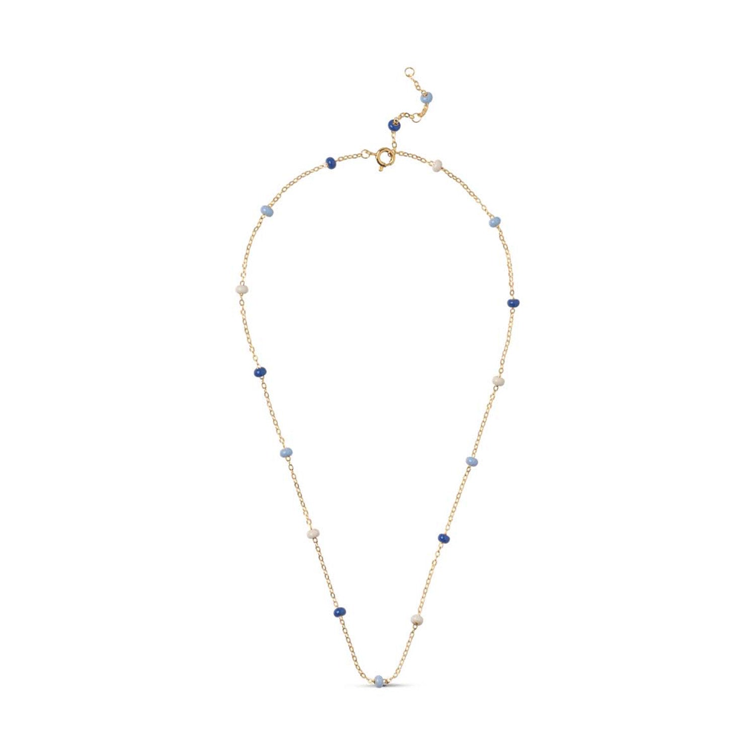 Halskæden er udsmykket med små, delikate perler i forskellige blå nuancer, der skaber en smuk kontrast til det forgyldte sølv. Den subtile kombination af farver giver et maritimt udtryk, der er både frisk og sofistikeret.