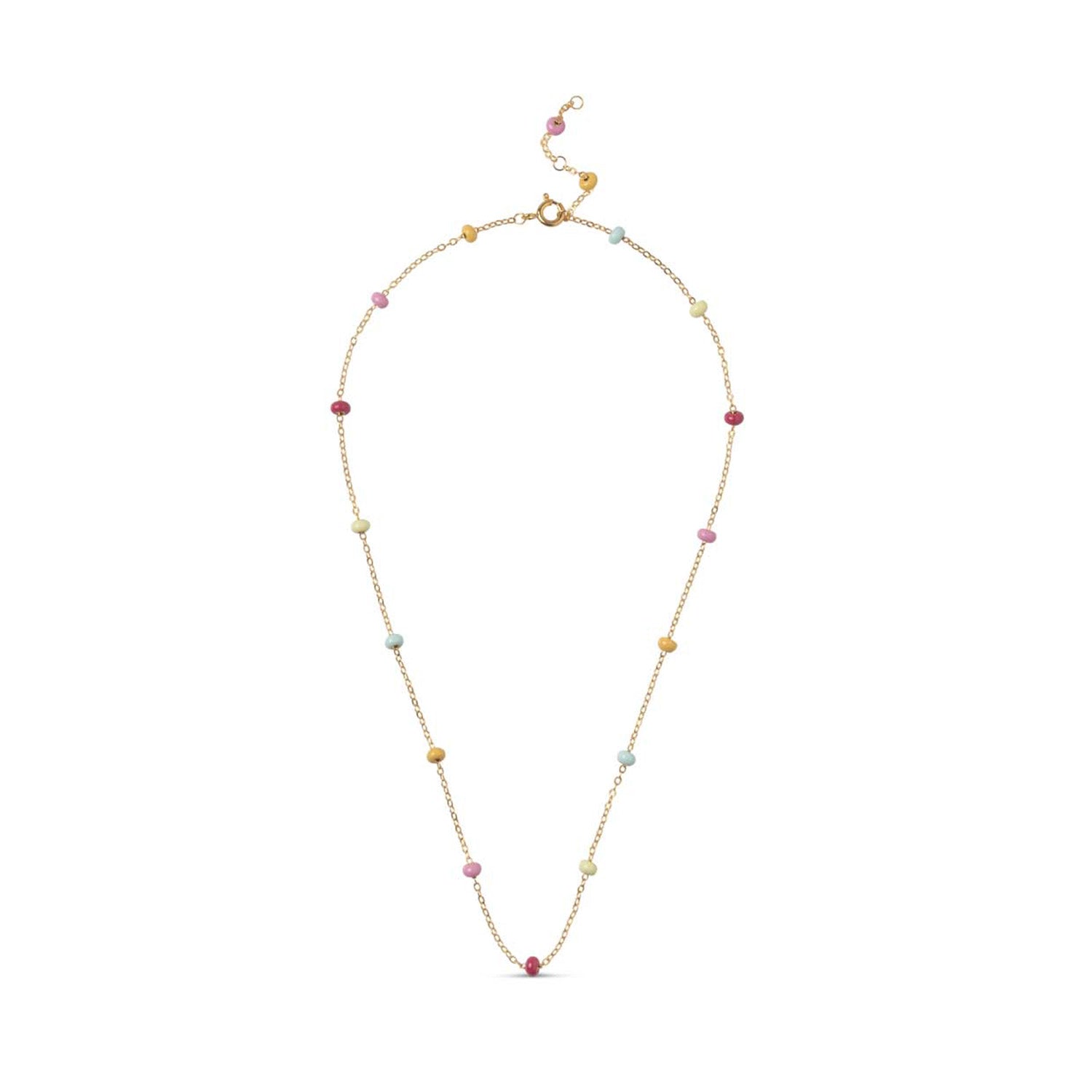 Halskæden er udført i forgyldt sølv og prydet med en række farverige perler, der skaber en regnbueeffekt. De små, delikate perler er omhyggeligt placeret langs kæden, hvilket giver et legende og sofistikeret udtryk. Den justerbare længde på 38+2+2 cm sikrer, at halskæden kan tilpasses til enhver stil og lejlighed.