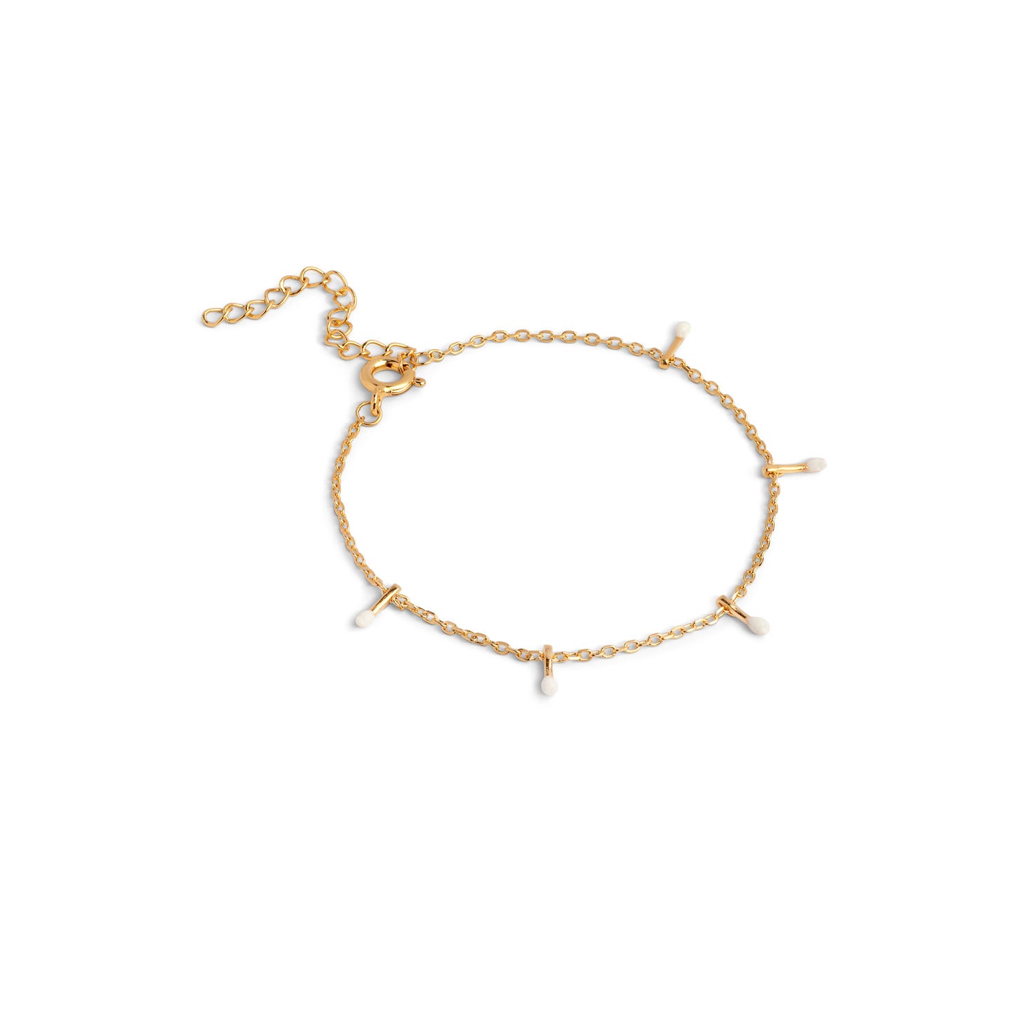 Armbåndet har en fortryllende kombination af hvid og guld, der skaber en harmonisk og sofistikeret æstetik. De små, delikate vedhæng tilføjer en subtil bevægelse og glans, der fanger lyset smukt. Den forgyldte overflade giver en varm glød, der komplementerer enhver hudtone.