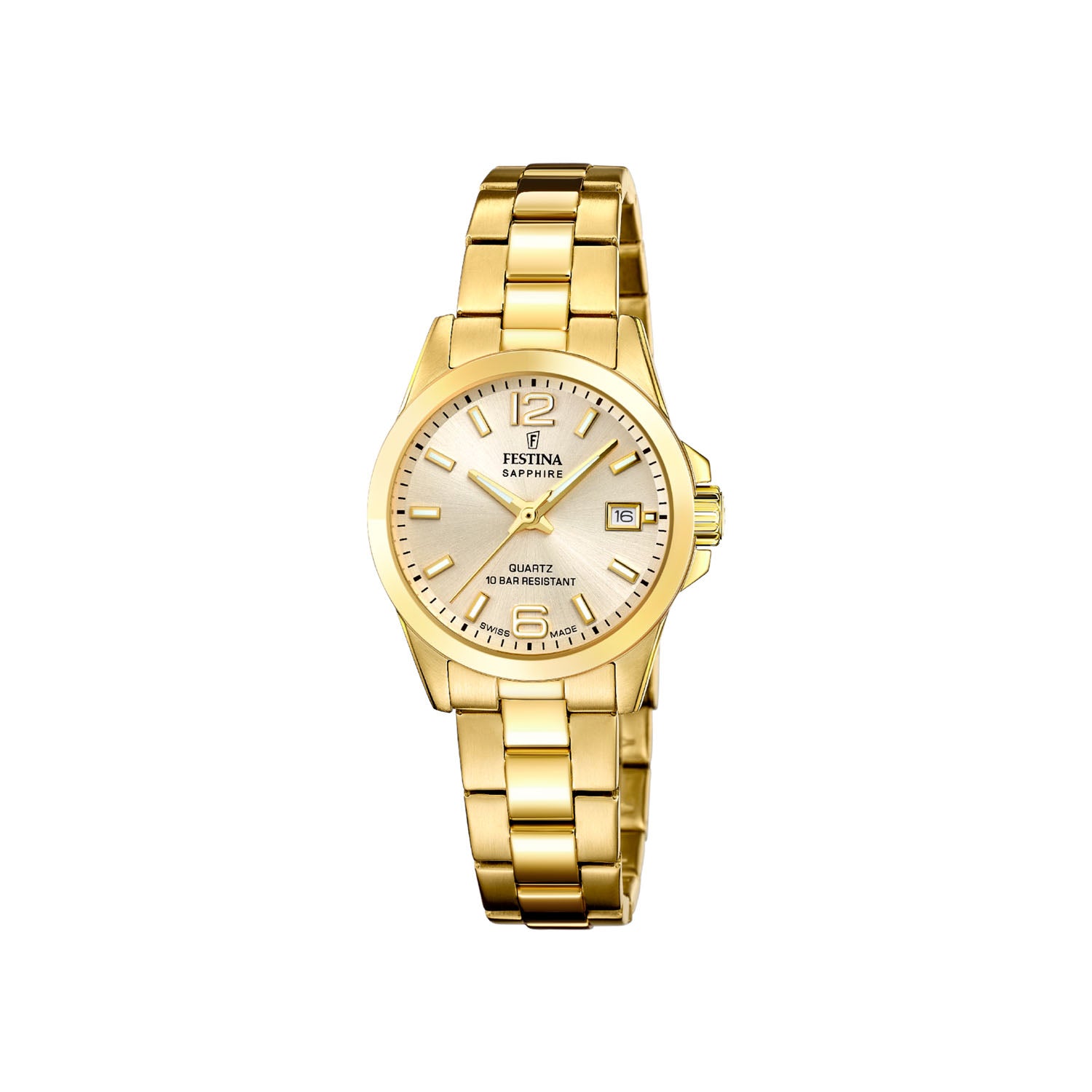 Oplev tidløs elegance med Festinas Swiss Made armbåndsur, designet specielt til kvinder, der værdsætter både stil og funktionalitet. Dette ur er udført i forgyldt stål, hvilket giver det en luksuriøs og holdbar finish, der passer til enhver lejlighed.