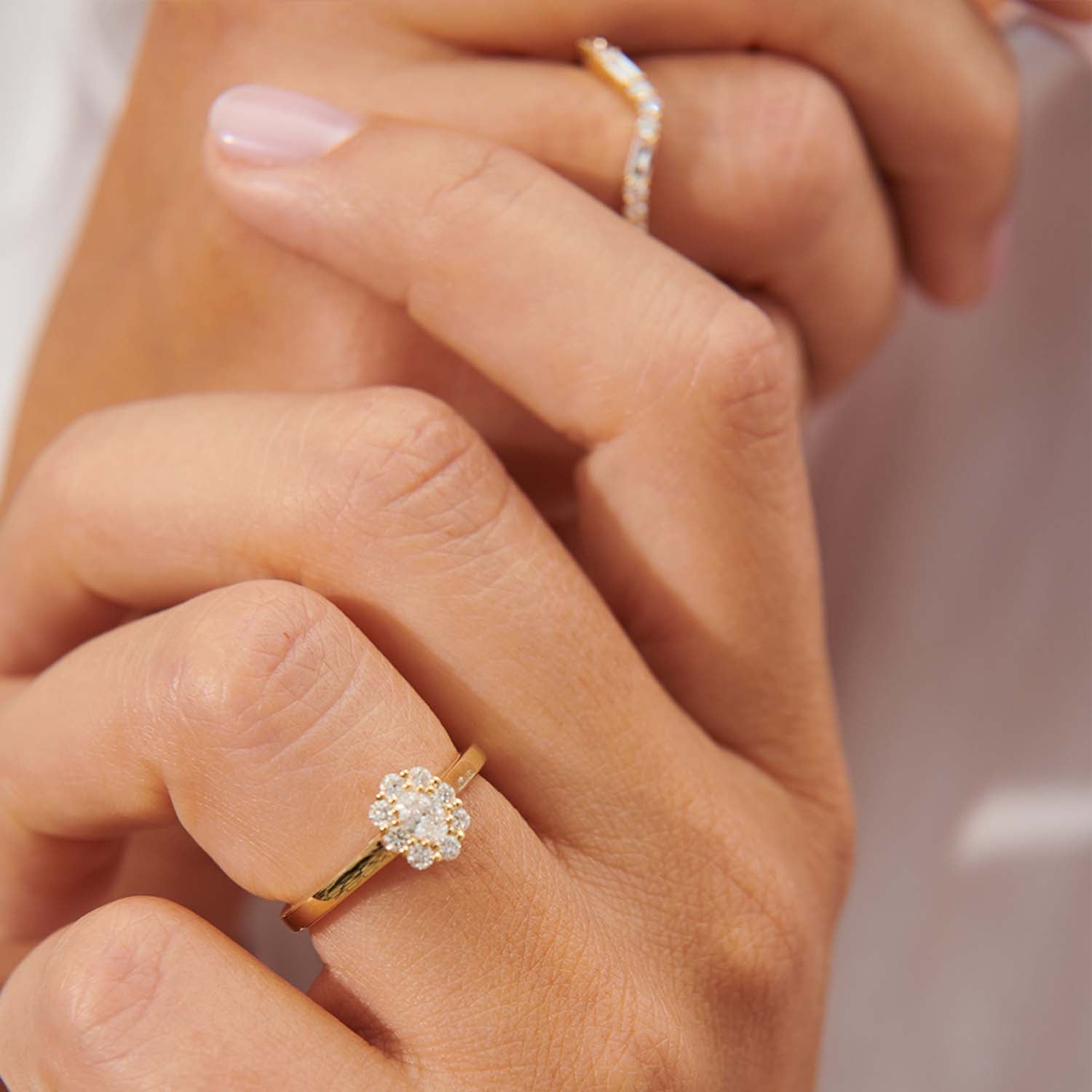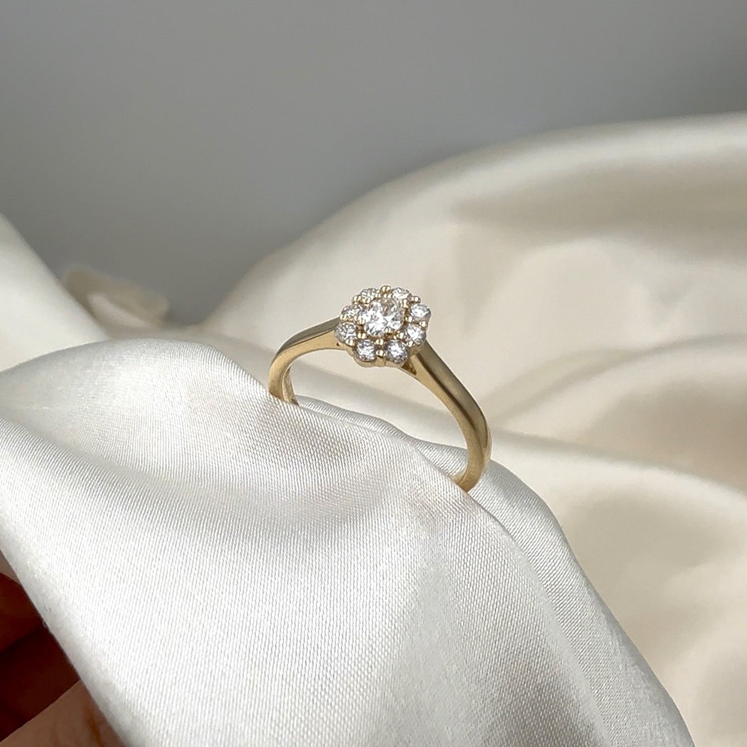 Med en oval diamant på 0,16ct og 8 brillanter, der tilsammen udgør 0,24ct, er denne ring et strålende eksempel på håndværk og kvalitet. Den gyldne glød fra guldet fremhæver diamanternes skønhed og skaber et smykke, der er både sofistikeret og iøjnefaldende.