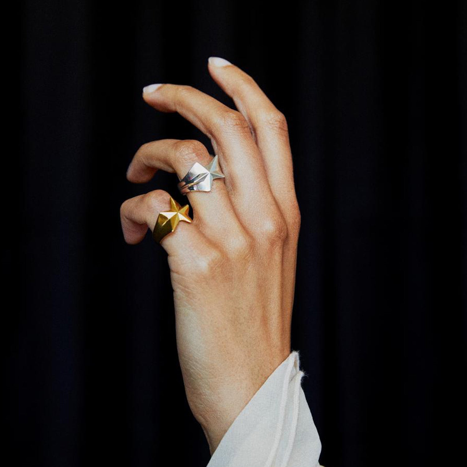 Den sølvfarvede overflade reflekterer lyset smukt og fremhæver ringens detaljer, hvilket gør den til et blikfang på enhver finger. Jane Kønigs Star Magic ring er ikke bare et smykke, men en erklæring om stil og elegance.