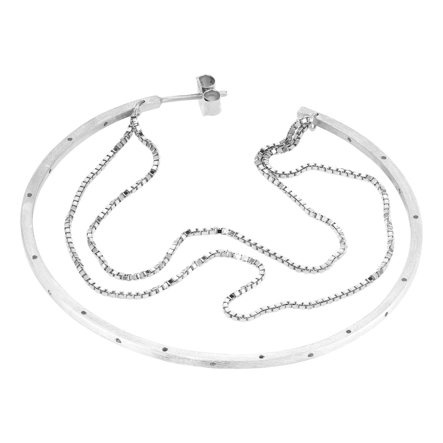 Øreringen er udført i en smuk sølvfarve, der giver et elegant og sofistikeret udtryk. Den glatte overflade kombineret med de fine kædedetaljer skaber en dynamisk tekstur, der fanger lyset på en subtil måde. Designet er både iøjnefaldende og diskret, hvilket gør det nemt at kombinere med andre smykker.