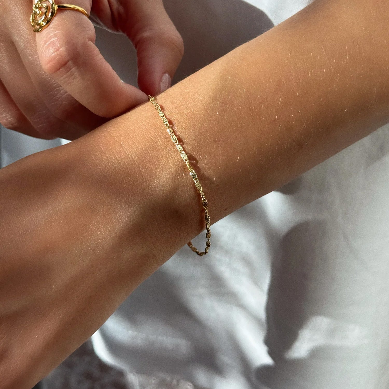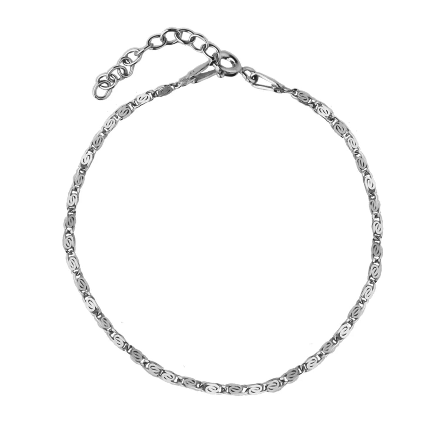 Armbåndet er udført i et smukt sølvdesign, der fremhæver dets subtile detaljer. De fine mønstre på kæden skaber en let og luftig følelse, mens den skinnende overflade reflekterer lyset på en elegant måde. Det slanke design gør det nemt at kombinere med andre smykker, eller bære alene for et minimalistisk look.