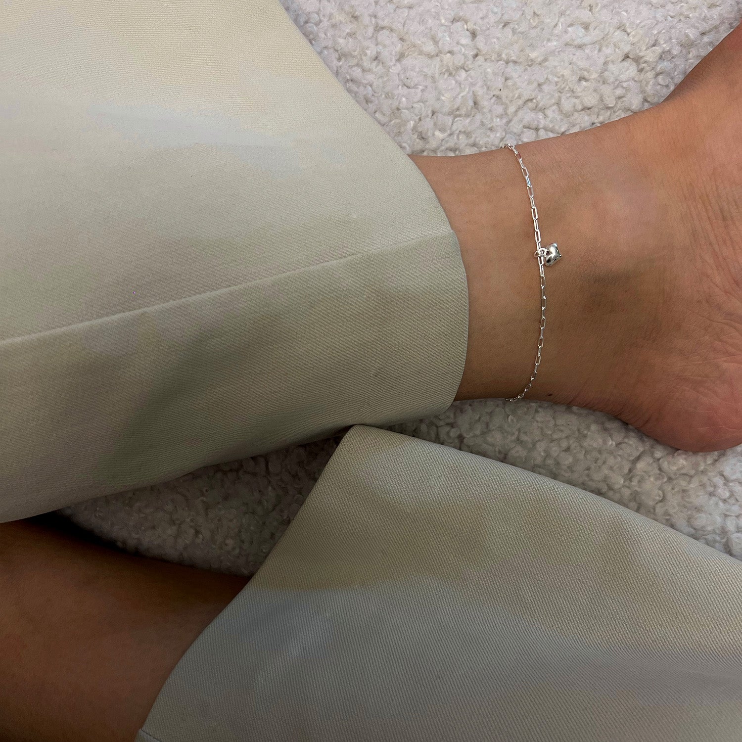 Den sølvfarvede kæde har en fin, glat tekstur, der føles behagelig mod huden. Det lille hjerte vedhæng tilføjer en subtil, men iøjnefaldende detalje, der fanger lyset og skaber en let glans. Denne ankelkæde er ikke kun et smykke, men også et udtryk for personlig stil og elegance.