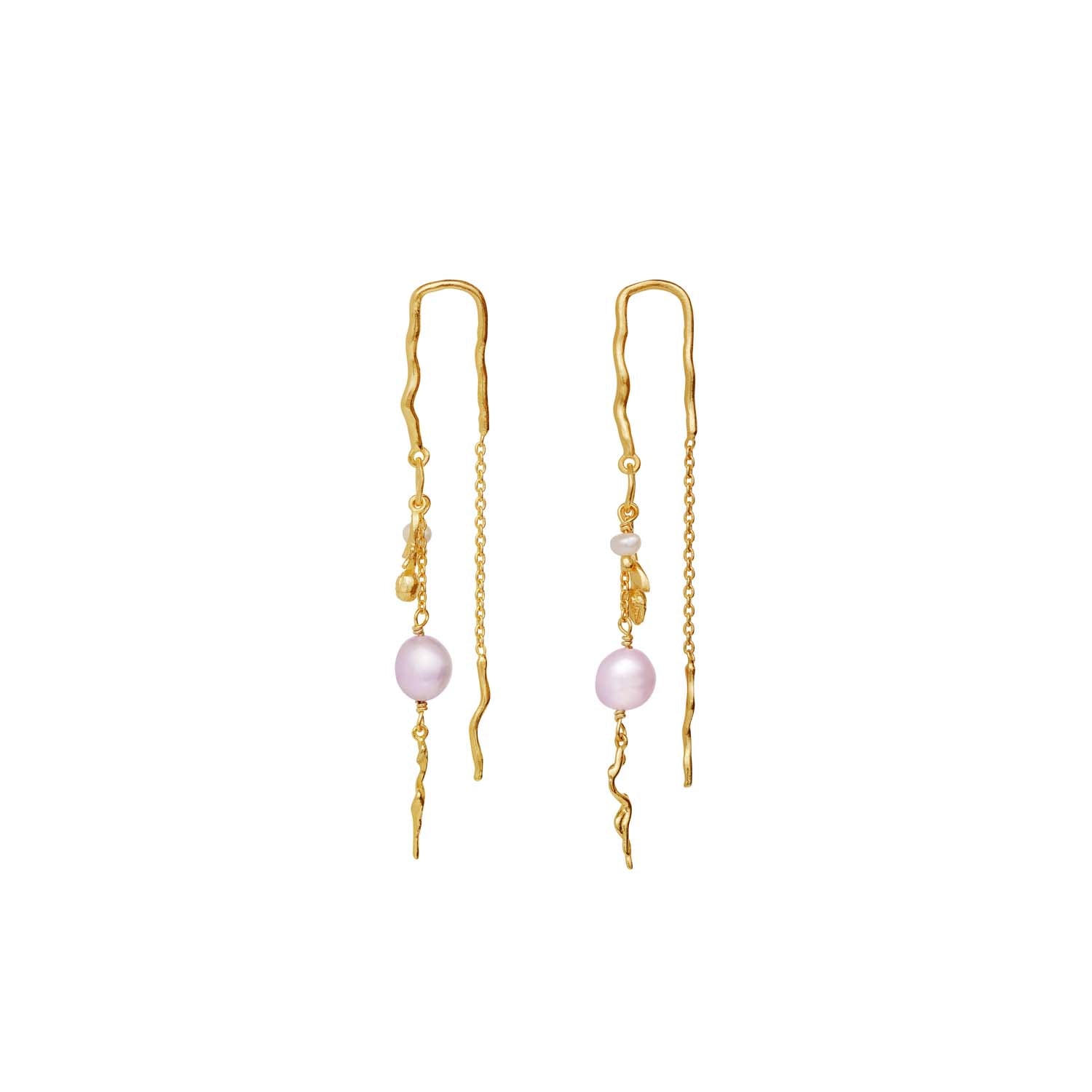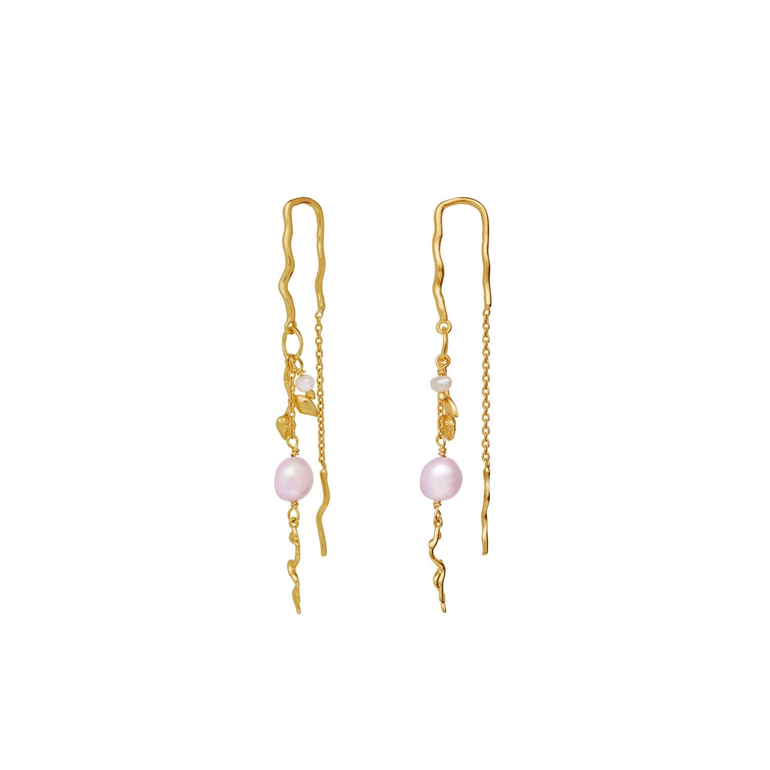 På billedet kan du se, hvordan de forgyldte øreringe fanger lyset og fremhæver de smukke, lyserøde perler, der hænger elegant fra de fine kæder. Den bølgede struktur tilføjer en organisk følelse, mens de små detaljer i perlerne giver et strejf af luksus. Øreringene har en let og luftig fornemmelse, der gør dem behagelige at bære hele dagen.