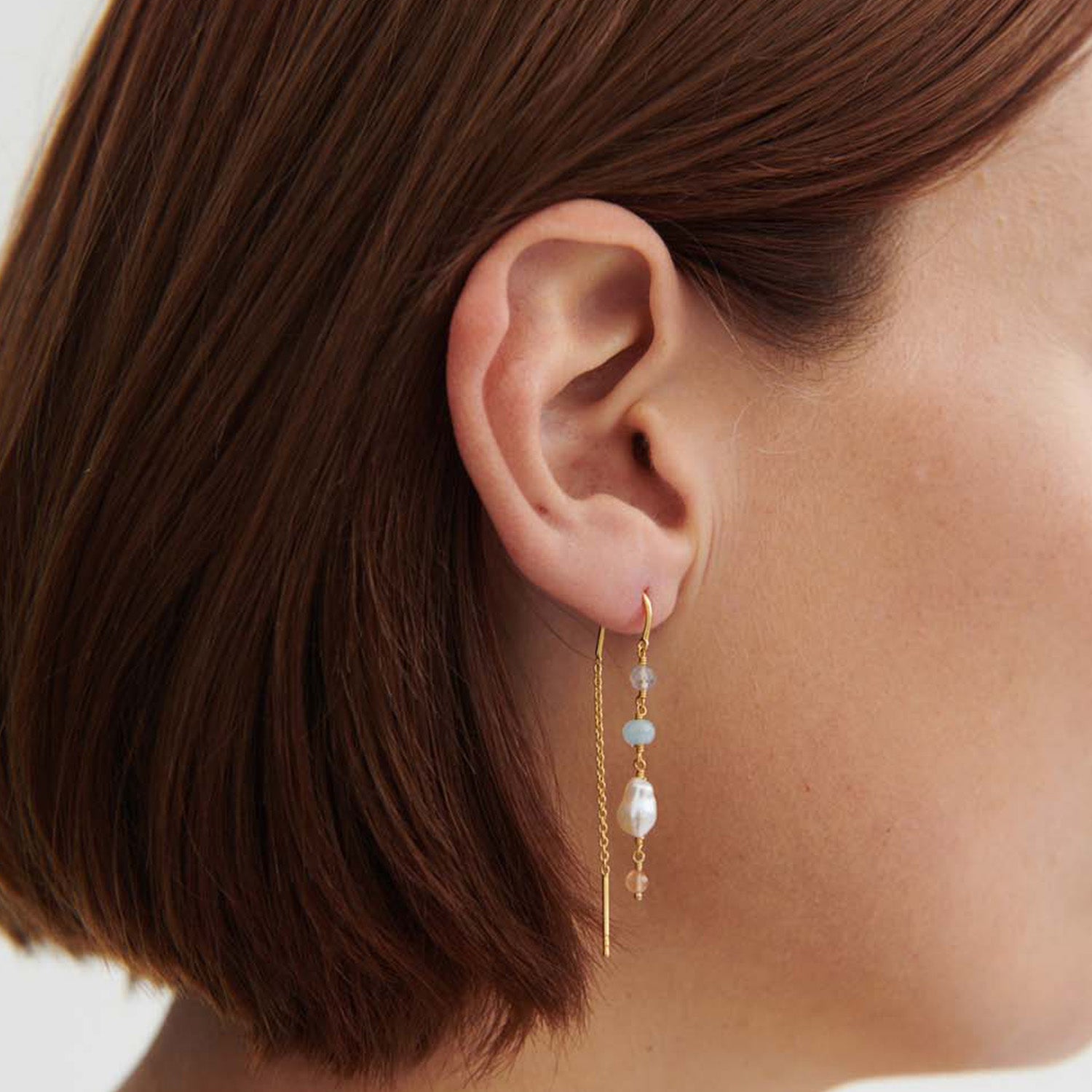 Disse øreringe er en fryd for øjet med deres delikate sammensætning af perler og sten i bløde nuancer. Den sølvfarvede kæde skaber en smuk kontrast til de lyse perler, hvilket giver et sofistikeret udtryk. Øreringene hænger elegant og bevæger sig let, hvilket tilføjer en dynamisk dimension til dit look.