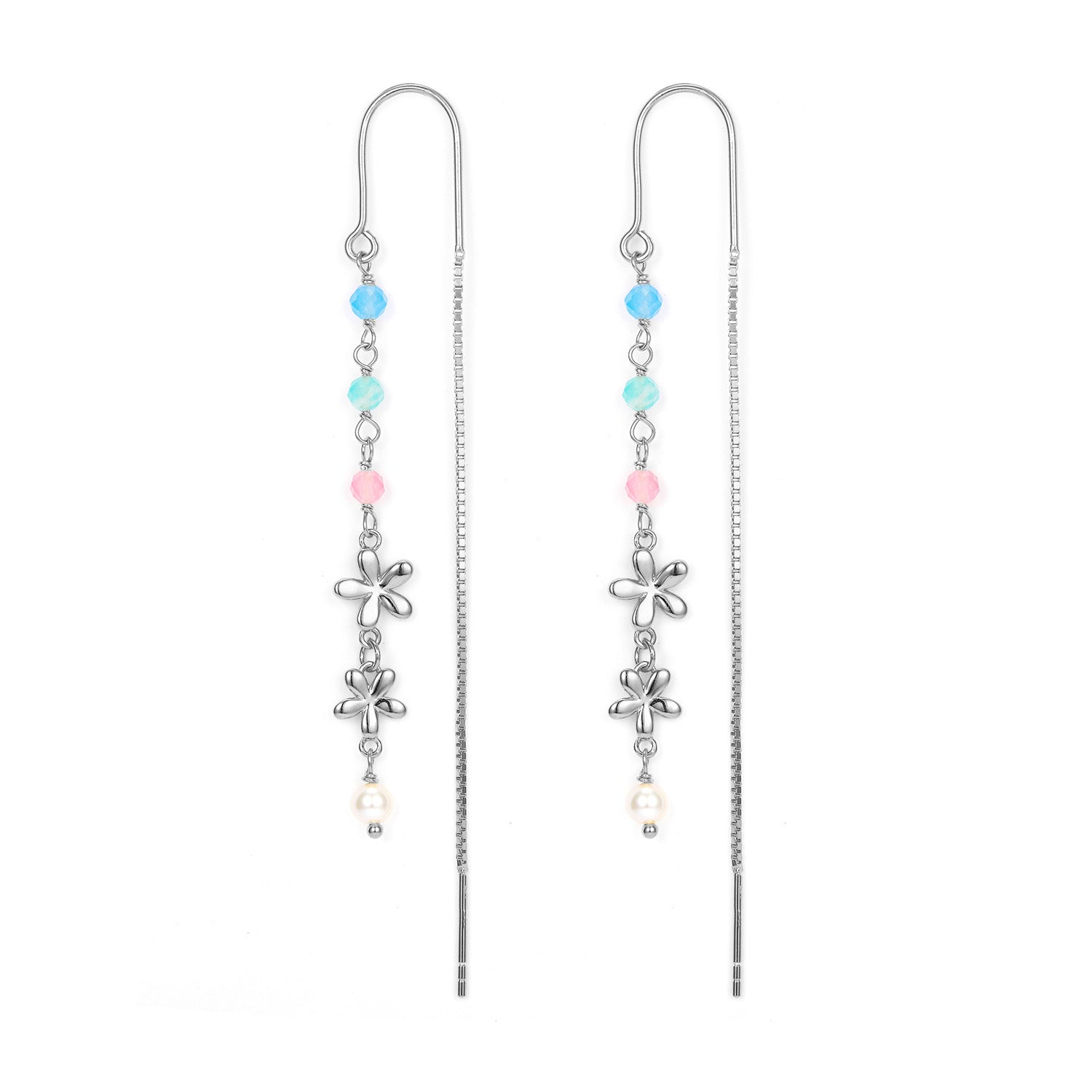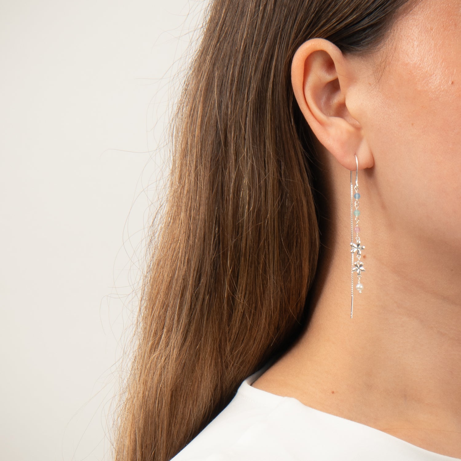 Disse øreringe kombinerer sølvets tidløse elegance med subtile farver i hvid og blå, hvilket skaber en harmonisk balance. De delikate blomsterdetaljer tilføjer et feminint touch, der gør dem ideelle til både hverdag og særlige begivenheder.