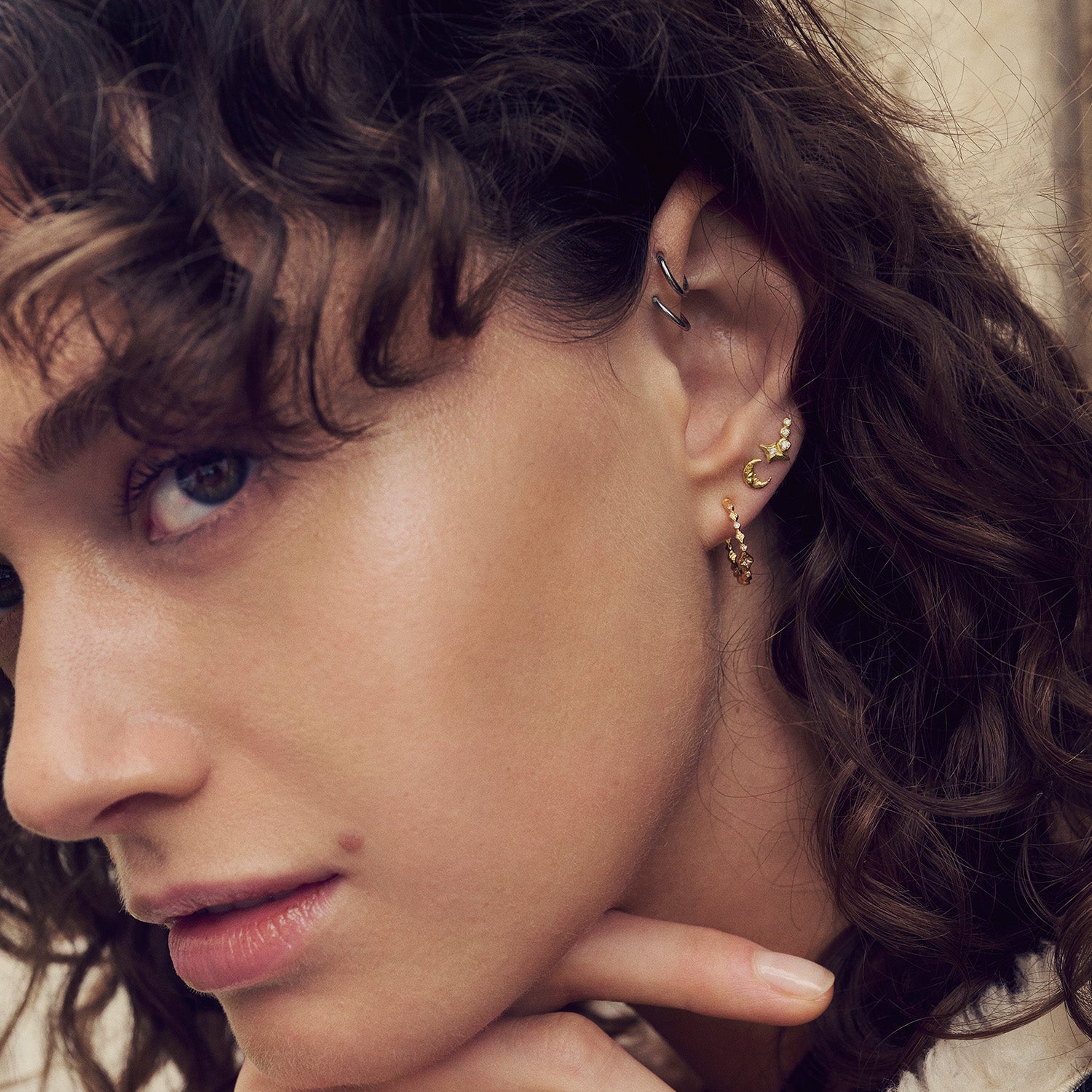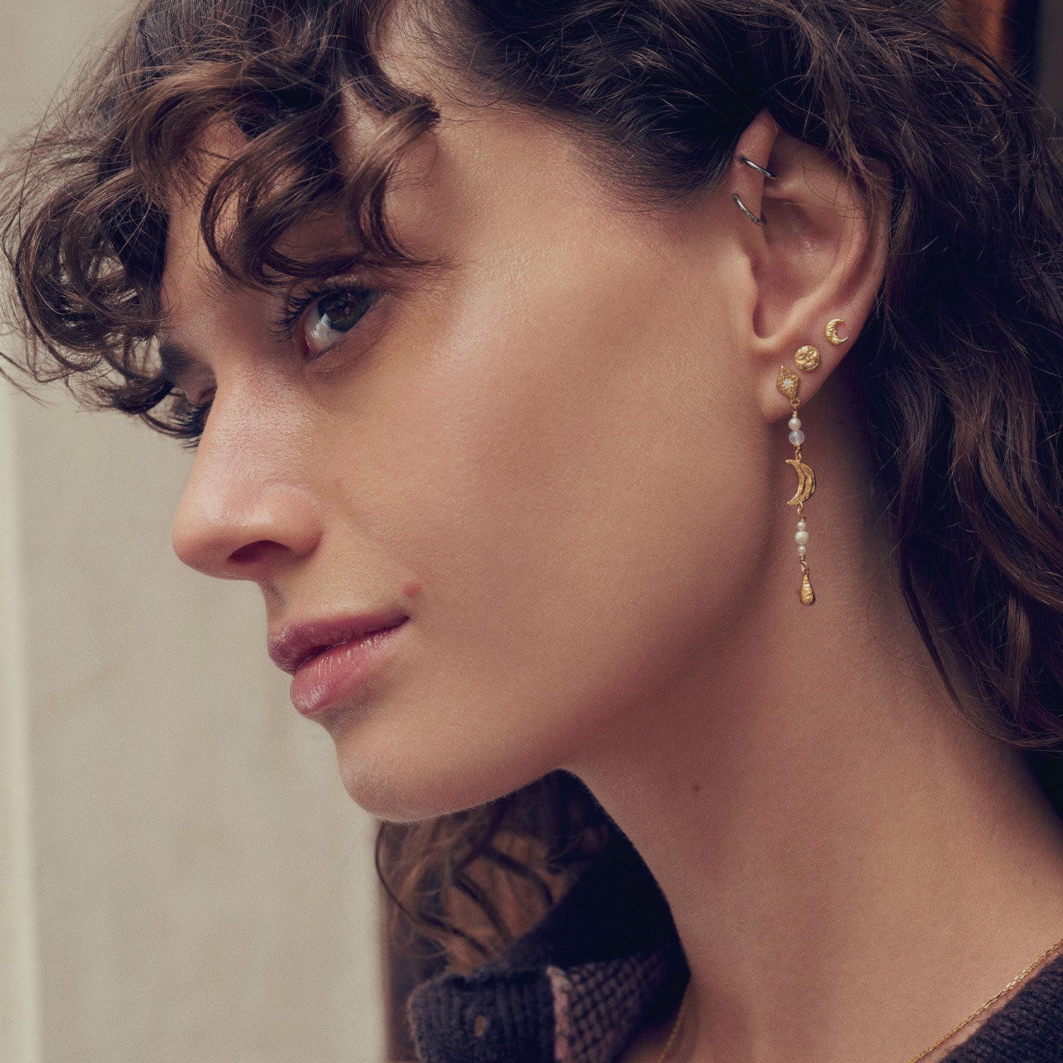 Øreringene har en delikat tekstur, der fanger lyset smukt og fremhæver den forgyldte overflades varme toner. Detaljerne i måneformen giver et subtilt, men iøjnefaldende udtryk, der gør dem til et samtaleemne.