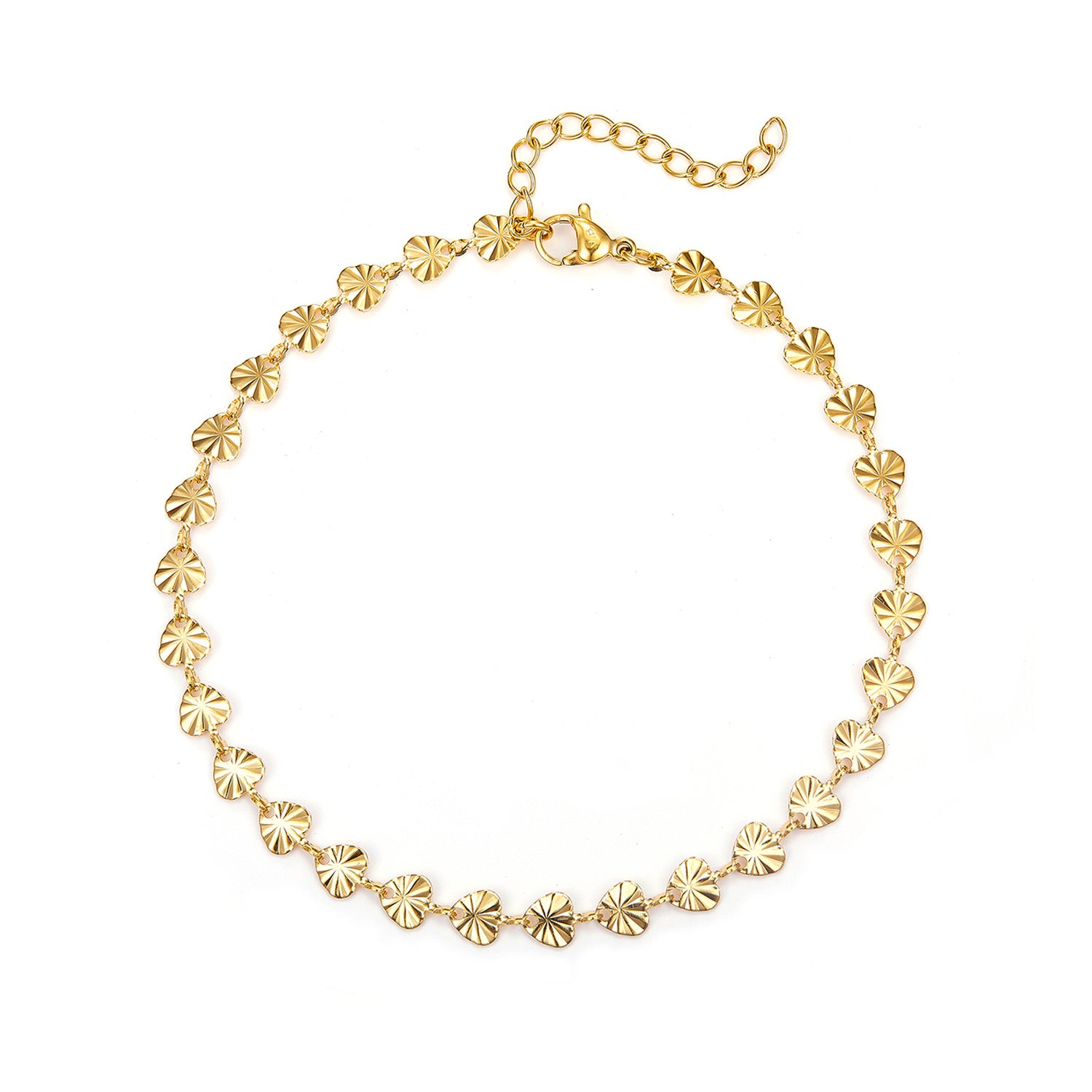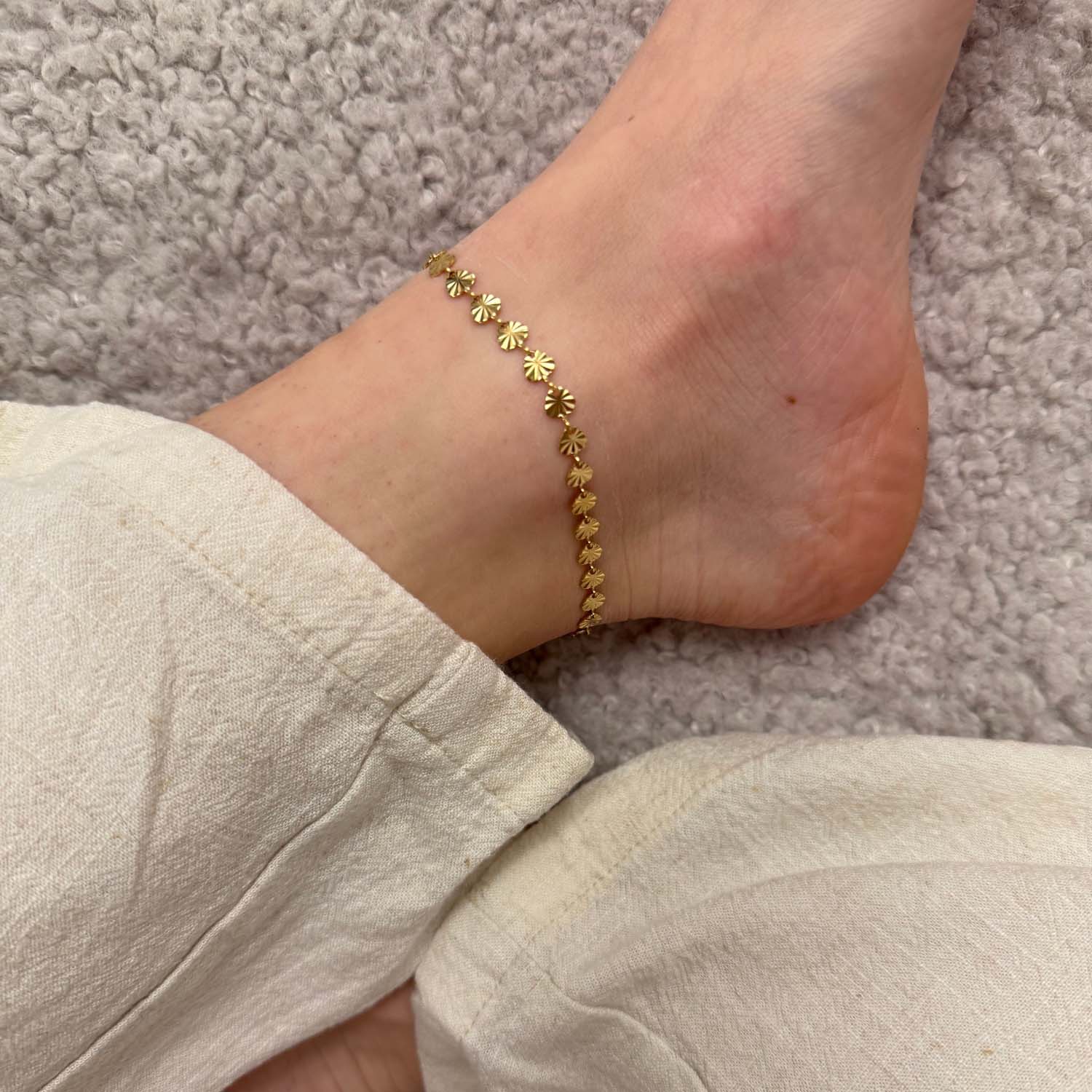 Den forgyldte ankelkæde er udført i rustfrit stål med en PVD guldbelægning, der giver en varm og indbydende glød. De små trekantede elementer skaber et unikt mønster, der fanger lyset smukt og tilføjer en ekstra dimension til designet. Kædens delikate struktur gør den behagelig at bære hele dagen, mens dens elegante udseende gør den ideel til både hverdag og særlige lejligheder. Kædens mønster på pladerne er identisk på for- og bagsiden.