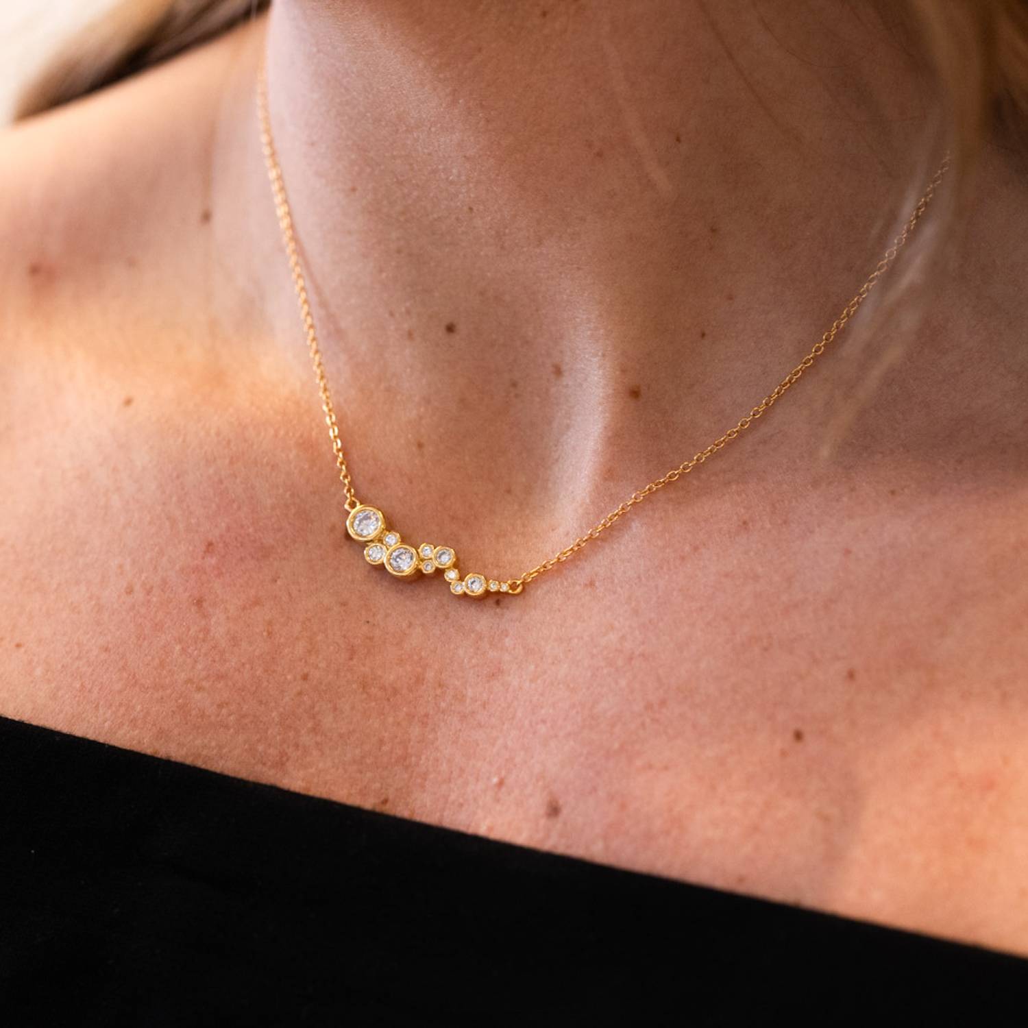 På billedet kan du se, hvordan de forskellige størrelser af zirkonia-sten er arrangeret i en elegant formation, der minder om en stjernehimmel. Den glatte tekstur af den forgyldte kæde føles behagelig mod huden, mens de skinnende sten fanger lyset fra alle vinkler. Dette smykke er ikke kun en visuel fornøjelse, men også en fornøjelse at bære.
