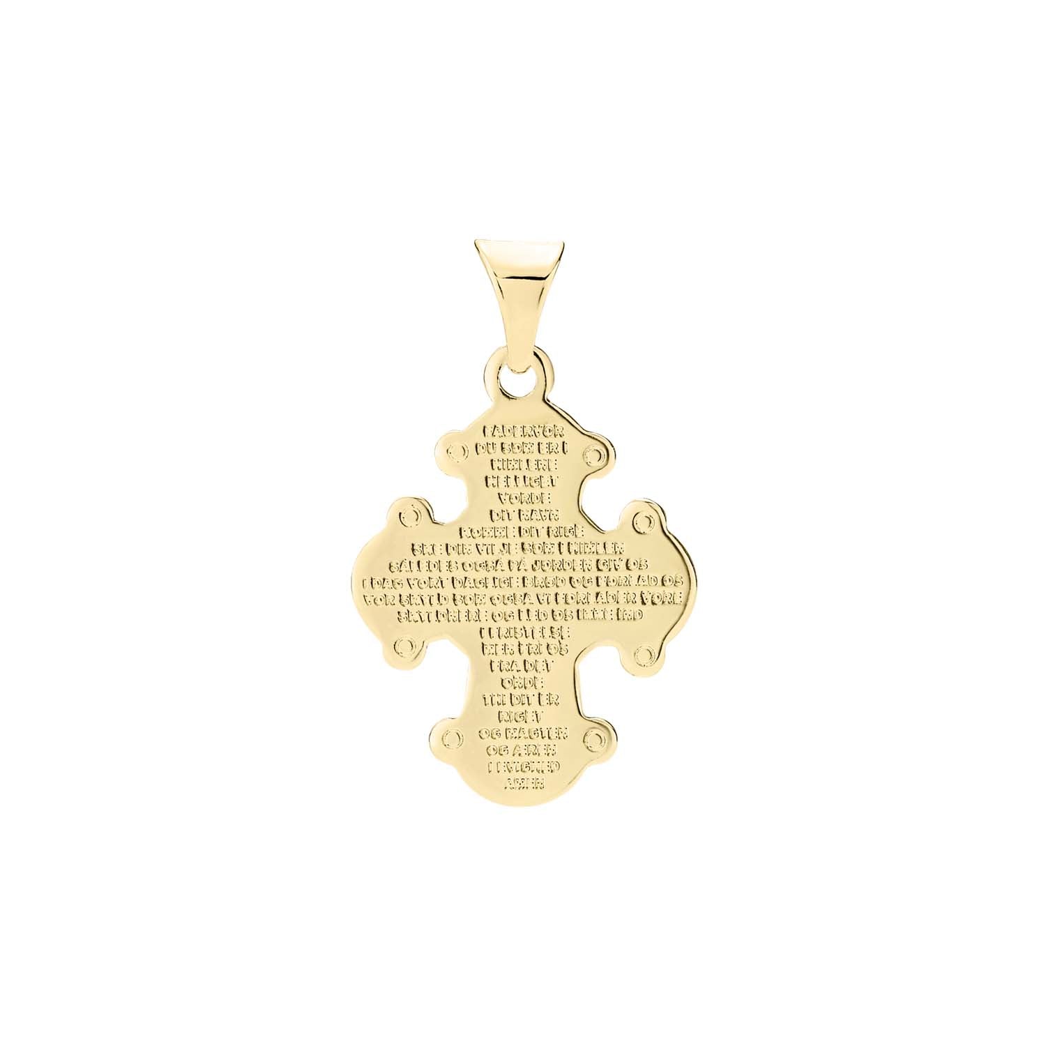 Dette vedhæng måler 16x14 mm og er en subtil, men betydningsfuld tilføjelse til enhver smykkesamling. Den gyldne farve fremhæver de fine detaljer i korset, mens den glatte overflade giver en behagelig følelse mod huden.