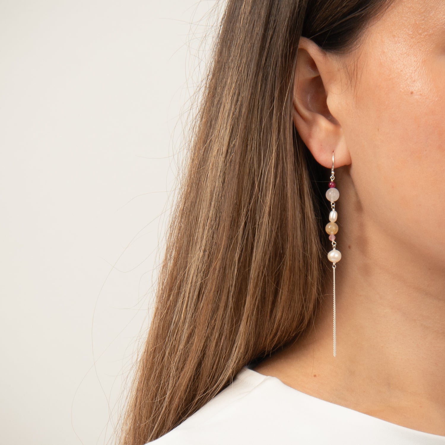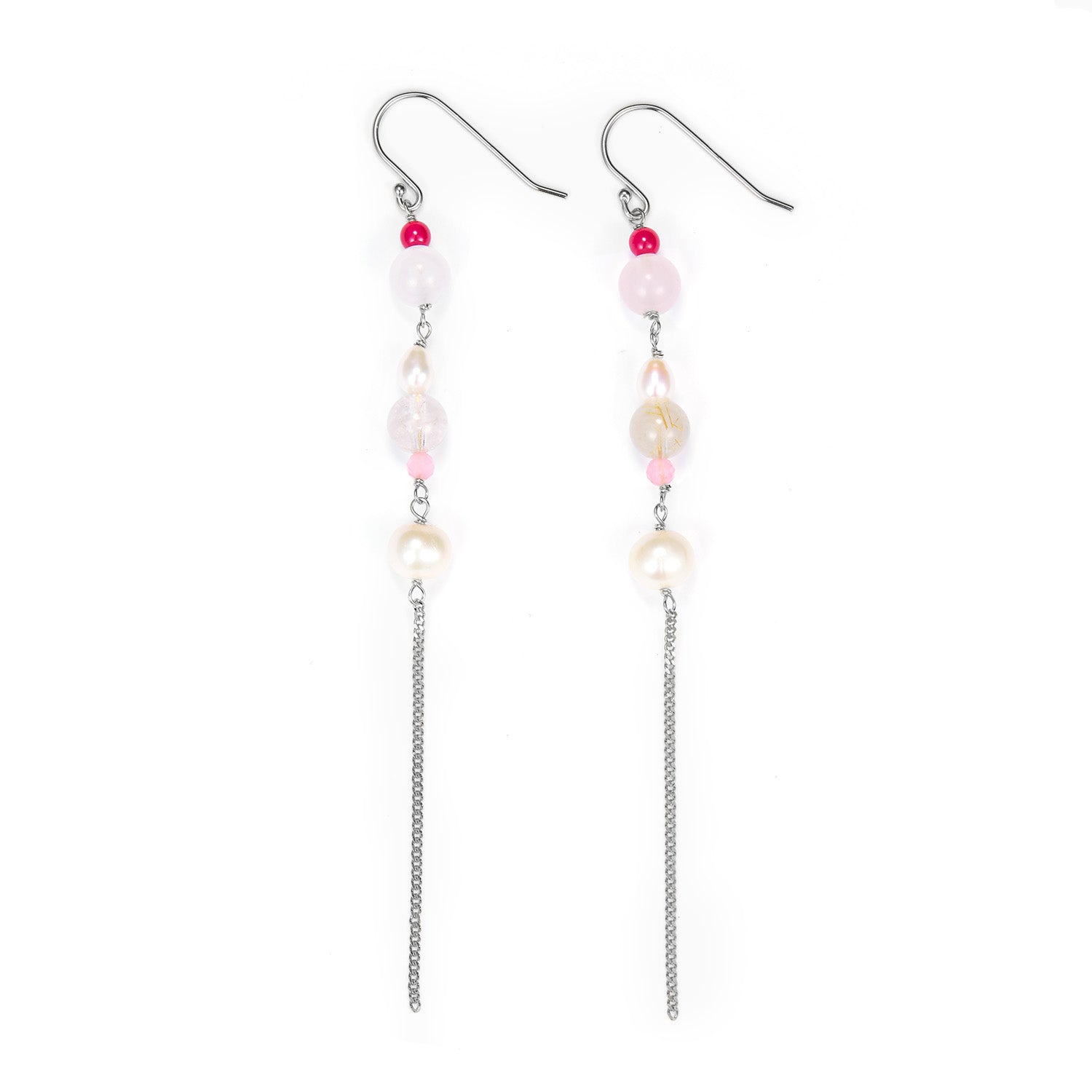 De elegante kæder falder yndefuldt og tilføjer en subtil bevægelse, der fanger lyset smukt. De lyserøde og pink perler giver et friskt pust af farve, mens de hvide perler tilføjer en klassisk elegance. Kombinationen af disse elementer skaber et unikt og iøjnefaldende design, der vil komplimentere enhver stil.
