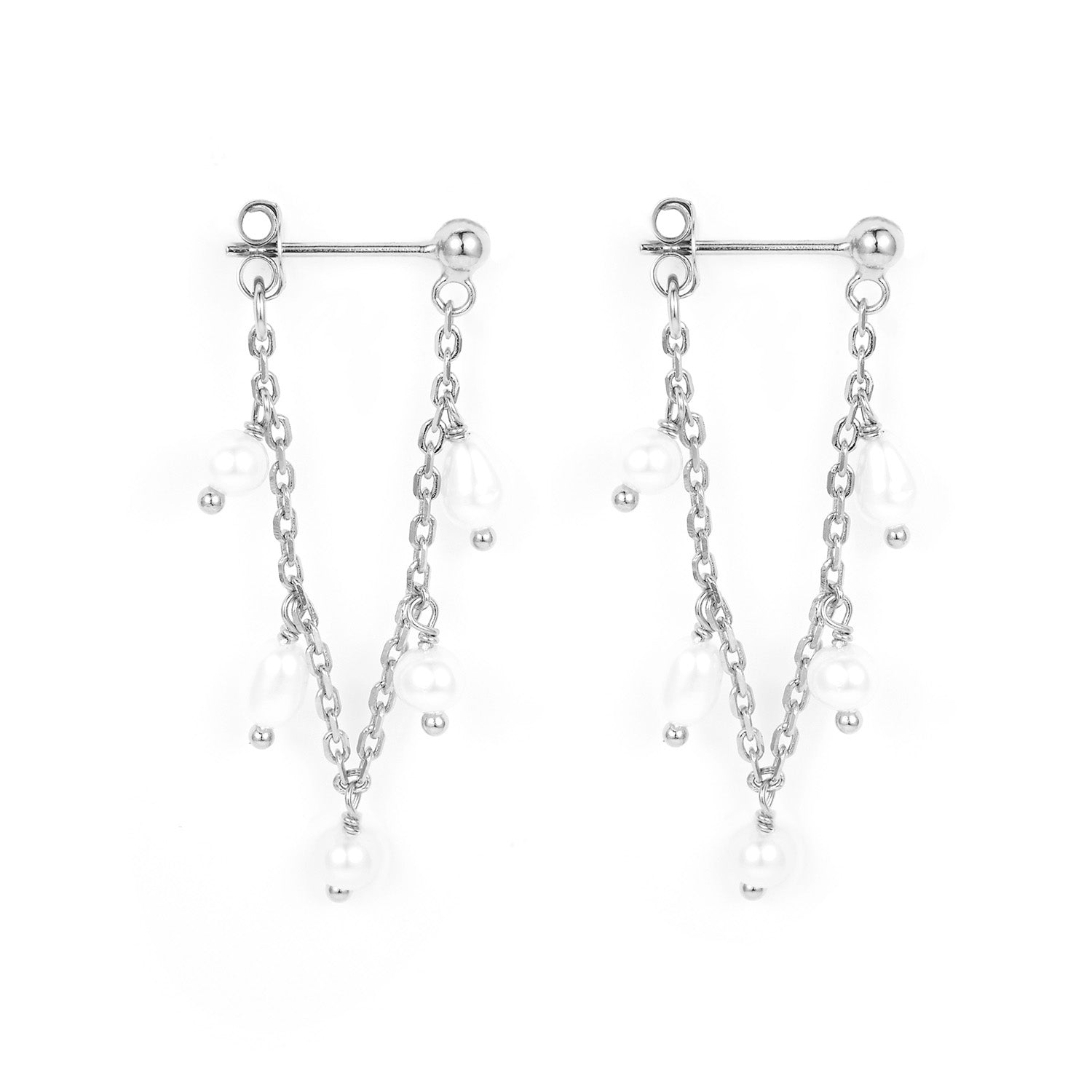 De fine kæder i sølv skaber en let og luftig fornemmelse, mens de hvide perler tilføjer en subtil elegance. Kombinationen af sølv og perler giver øreringene en klassisk, men moderne appel, der gør dem til et alsidigt tilbehør.