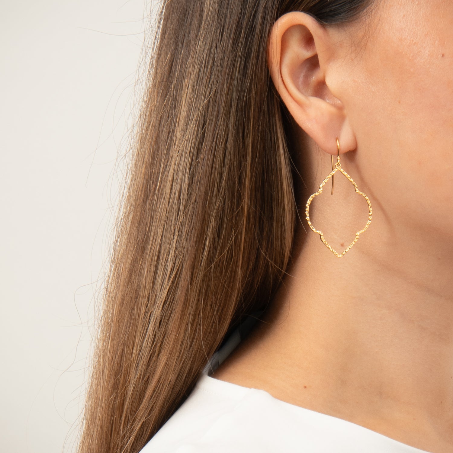Disse øreringe i forgyldt sølv udstråler en varm gylden farve, der fanger lyset smukt og tilføjer en subtil glans til dit look. Den delikate form og det åbne design giver dem en lethed, der gør dem behagelige at bære hele dagen. Øreringene har en unik struktur, der tilføjer dybde og karakter, hvilket gør dem til et iøjnefaldende valg.