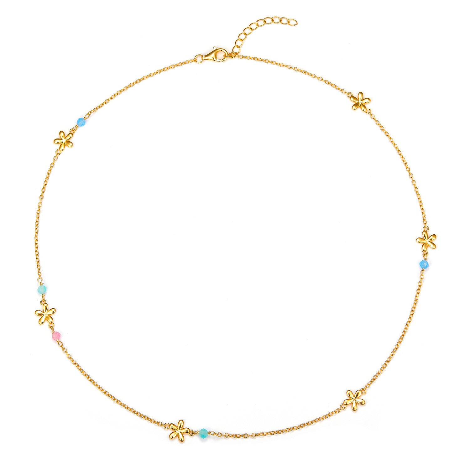 Den gyldne nuance af forgyldt sølv skaber en varm glød, der komplementeres af de blå detaljer, som tilføjer en frisk og moderne dimension. Halskædens blomsterdesign er både subtilt og iøjnefaldende, hvilket gør den til et alsidigt smykke, der kan bæres til både hverdag og fest.