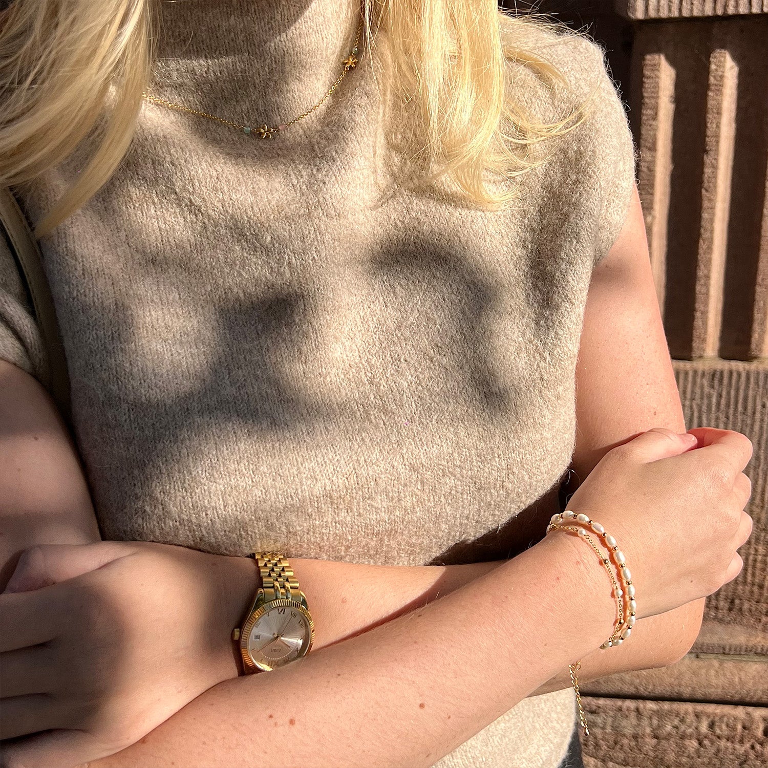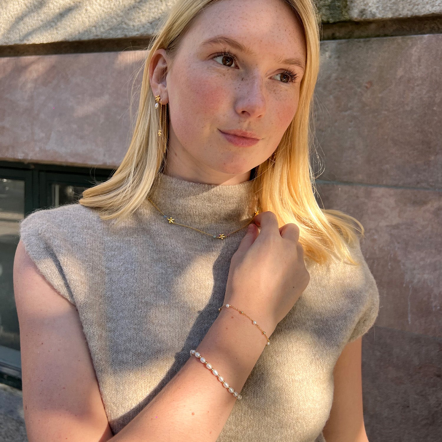 Den fine kæde er let og behagelig at bære, og dens justerbare længde sikrer, at den passer perfekt til enhver stil. De små blomsterdetaljer giver et strejf af naturens skønhed, mens den forgyldte overflade reflekterer lyset smukt.