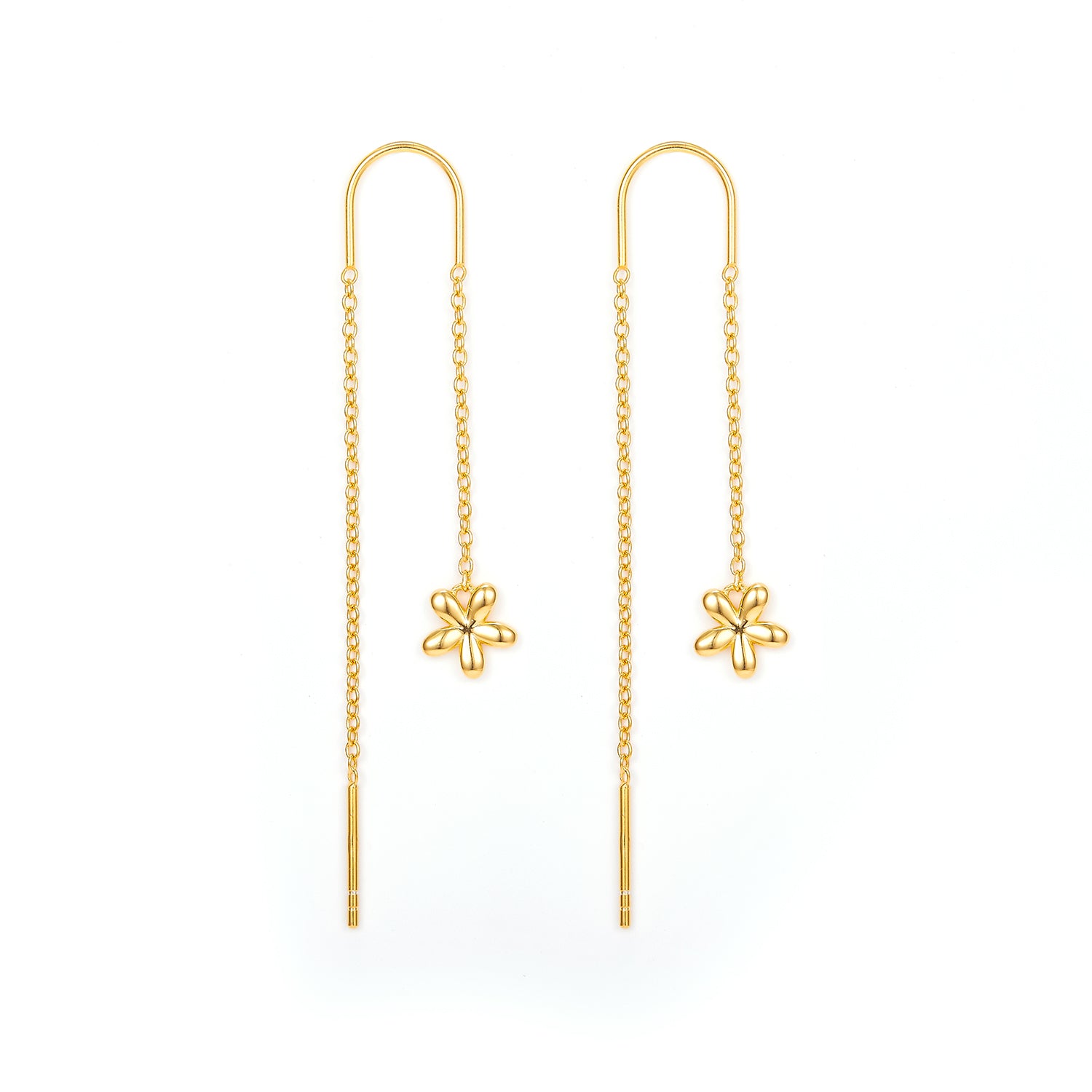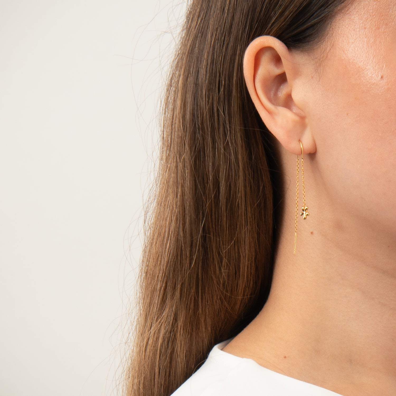 Ørekæderne er 4 cm lange og har en gylden nuance, der fanger lyset på en subtil og indbydende måde. Den forgyldte overflade giver en varm glød, mens de delikate blomsterdetaljer skaber en følelse af lethed og elegance.