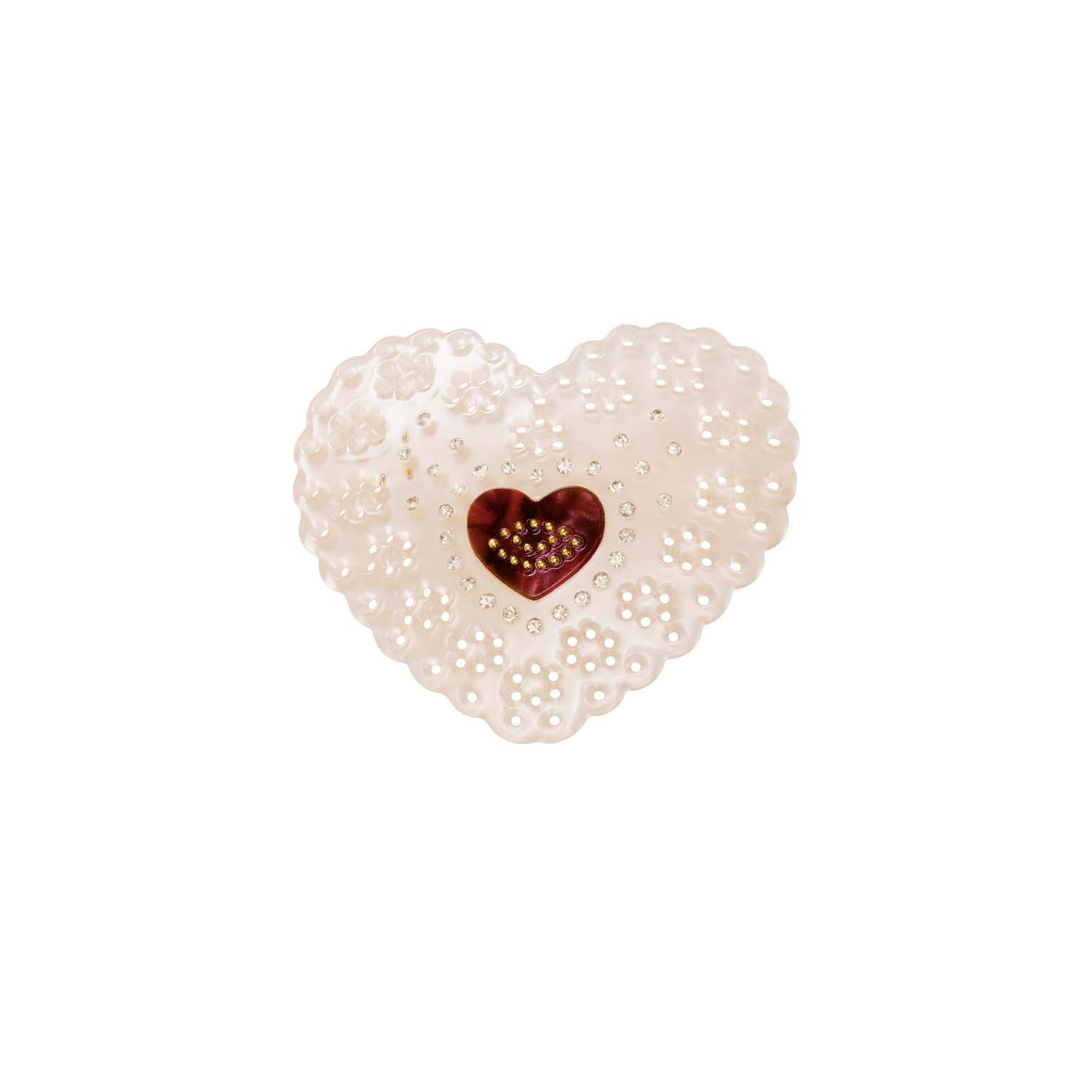 Hårklemmen er designet med et smukt hjerteformet mønster, der tilføjer en romantisk og feminin detalje. Den perlemorsagtige overflade reflekterer lyset på en subtil måde, hvilket giver et sofistikeret udtryk. Den brune nuance komplementerer perlemoren og skaber en harmonisk farvepalet, der passer til både hverdag og fest.