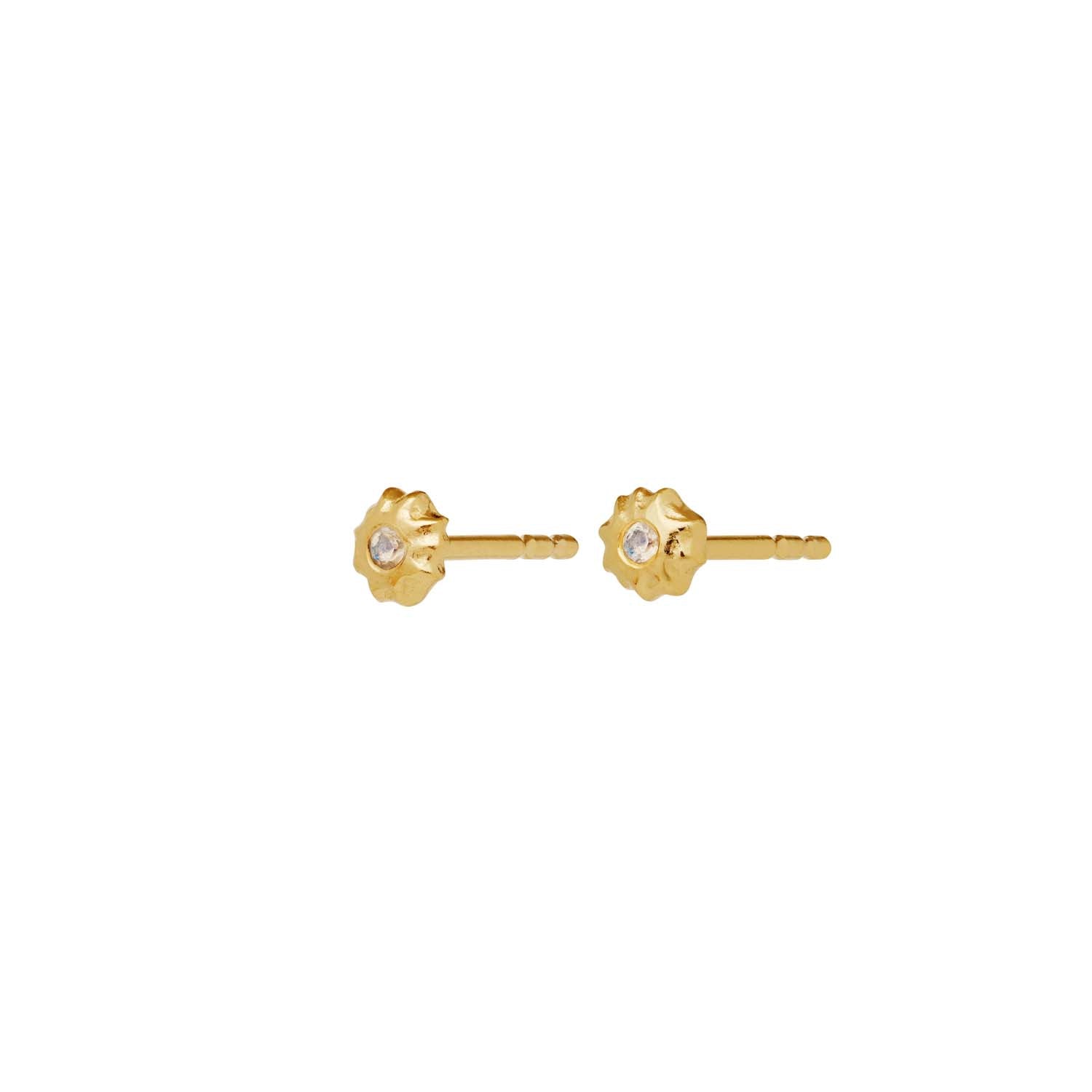Disse øreringe er skabt med en smuk, organisk form, der minder om små solstråler. Den forgyldte overflade fanger lyset på en måde, der fremhæver deres delikate detaljer. Øreringene har en central sten, der tilføjer et subtilt skær og elegance. Den teksturerede overflade giver en følelse af dybde og håndværk, som gør dem til et kunstværk i sig selv.