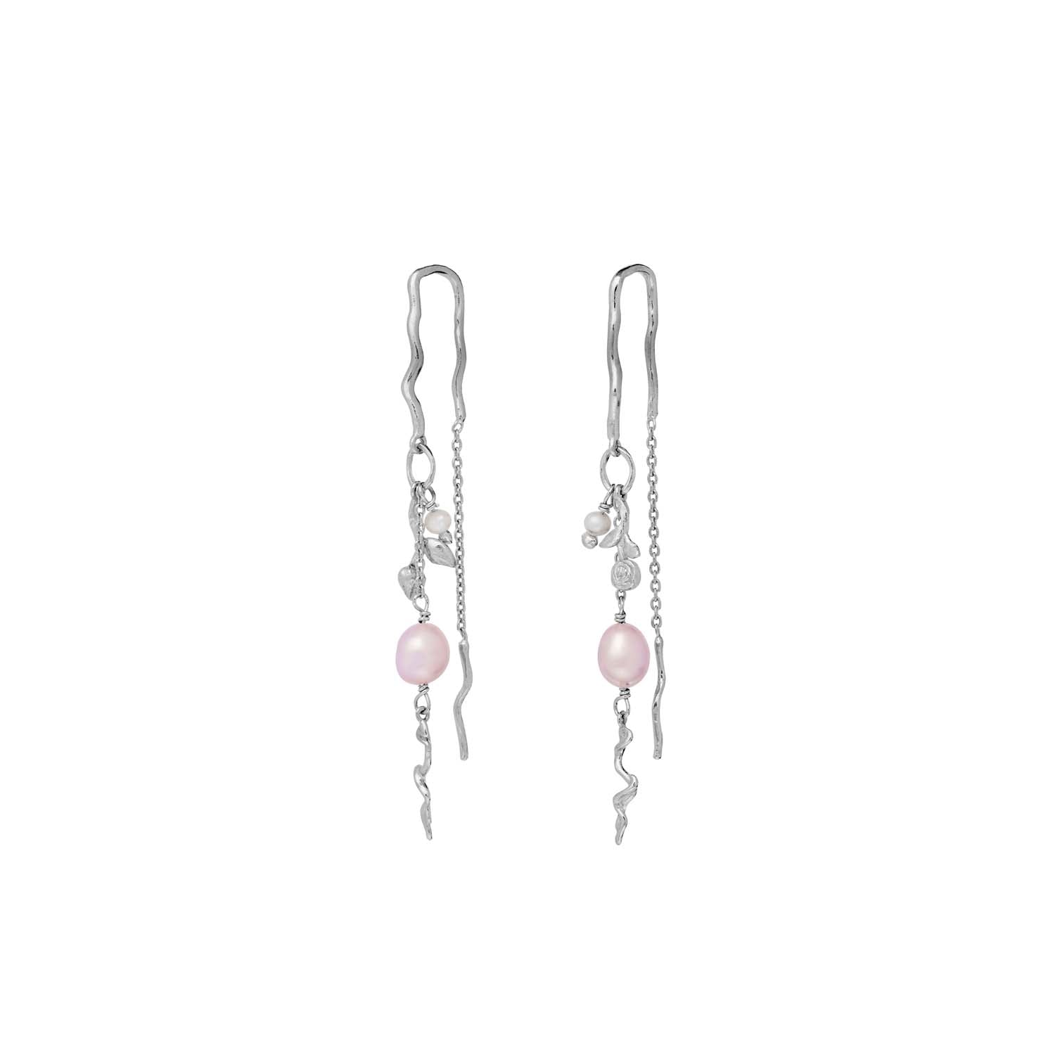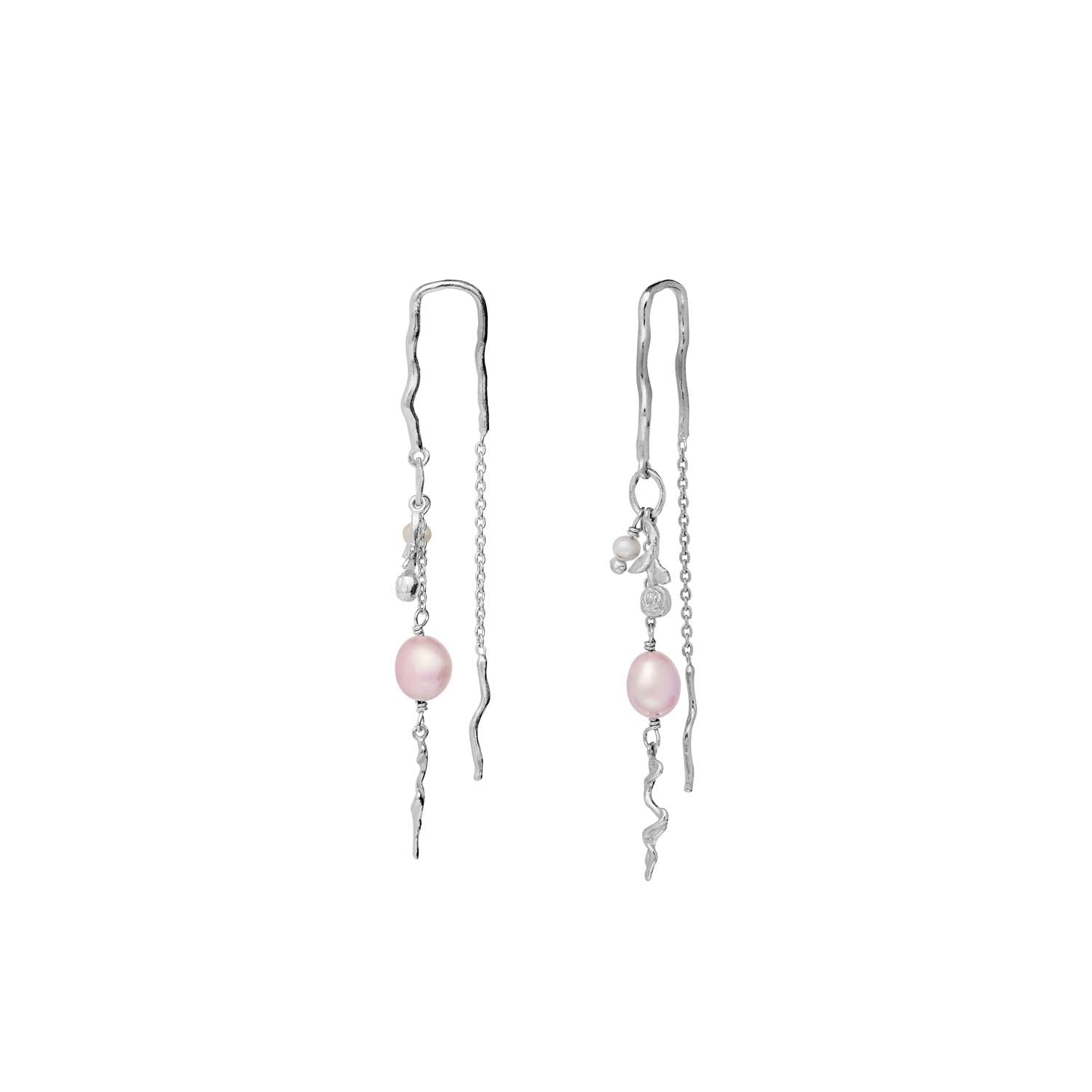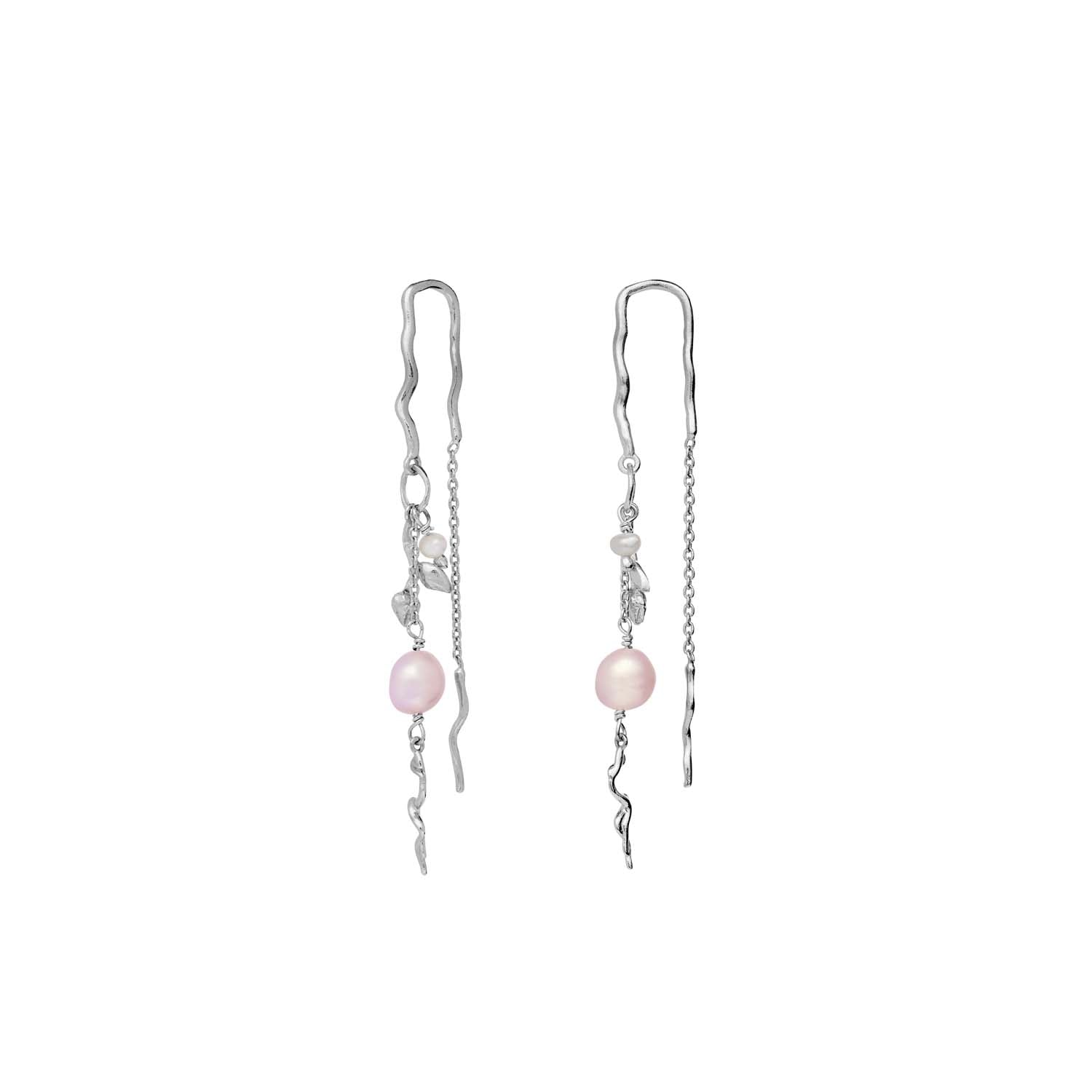 Disse øreringe er udført i sølv og har en smuk, bølget form, der fanger lyset på en subtil måde. De delikate lyserøde perler tilføjer en blød farve, der komplementerer det kølige sølv perfekt. Øreringene har en let tekstur, der giver dem en organisk og naturlig følelse.