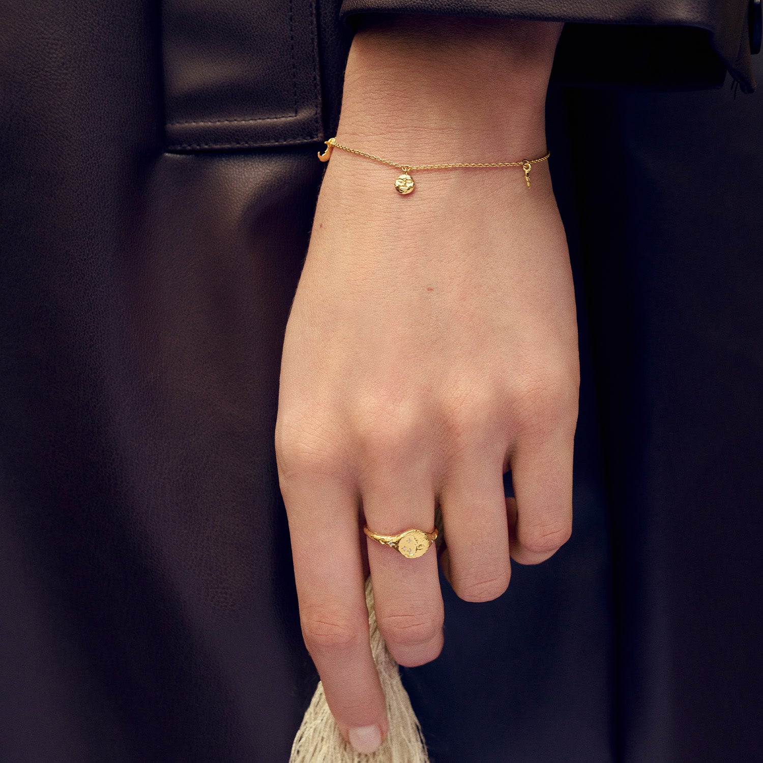 Armbåndet har en delikat kæde, der smyger sig om håndleddet med lethed. De små månesymboler tilføjer en subtil elegance, der fanger lyset og skaber en blid glans. Den forgyldte overflade giver armbåndet en tidløs appel, der gør det til et alsidigt tilbehør til både hverdag og fest.