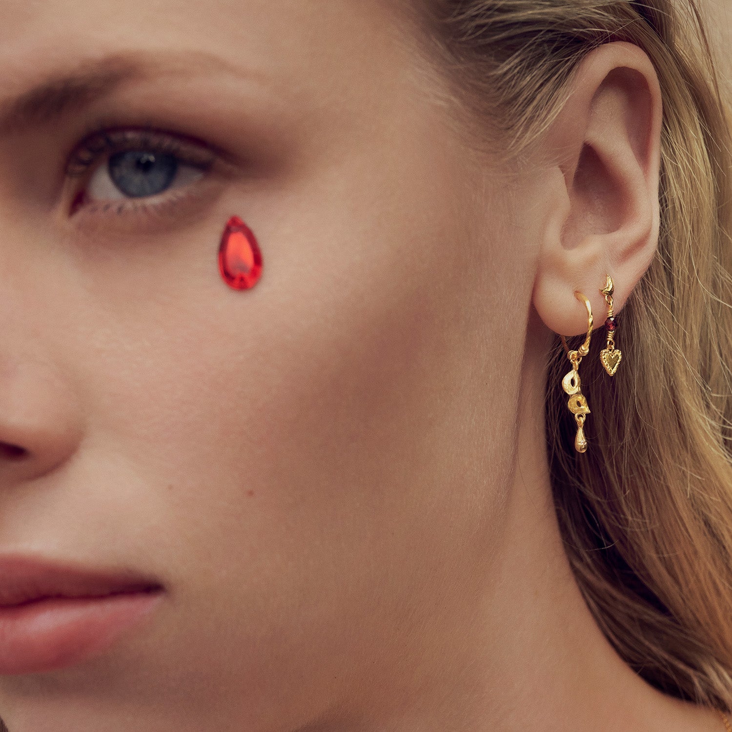 Øreringene udstråler en varm gylden glød, der komplementeres af de dybe røde nuancer i de indlagte detaljer. Den forgyldte overflade fanger lyset smukt, hvilket giver et elegant og sofistikeret udtryk. De delikate hjerte- og måneformer tilføjer en subtil charme, der gør dem til et iøjnefaldende tilbehør.