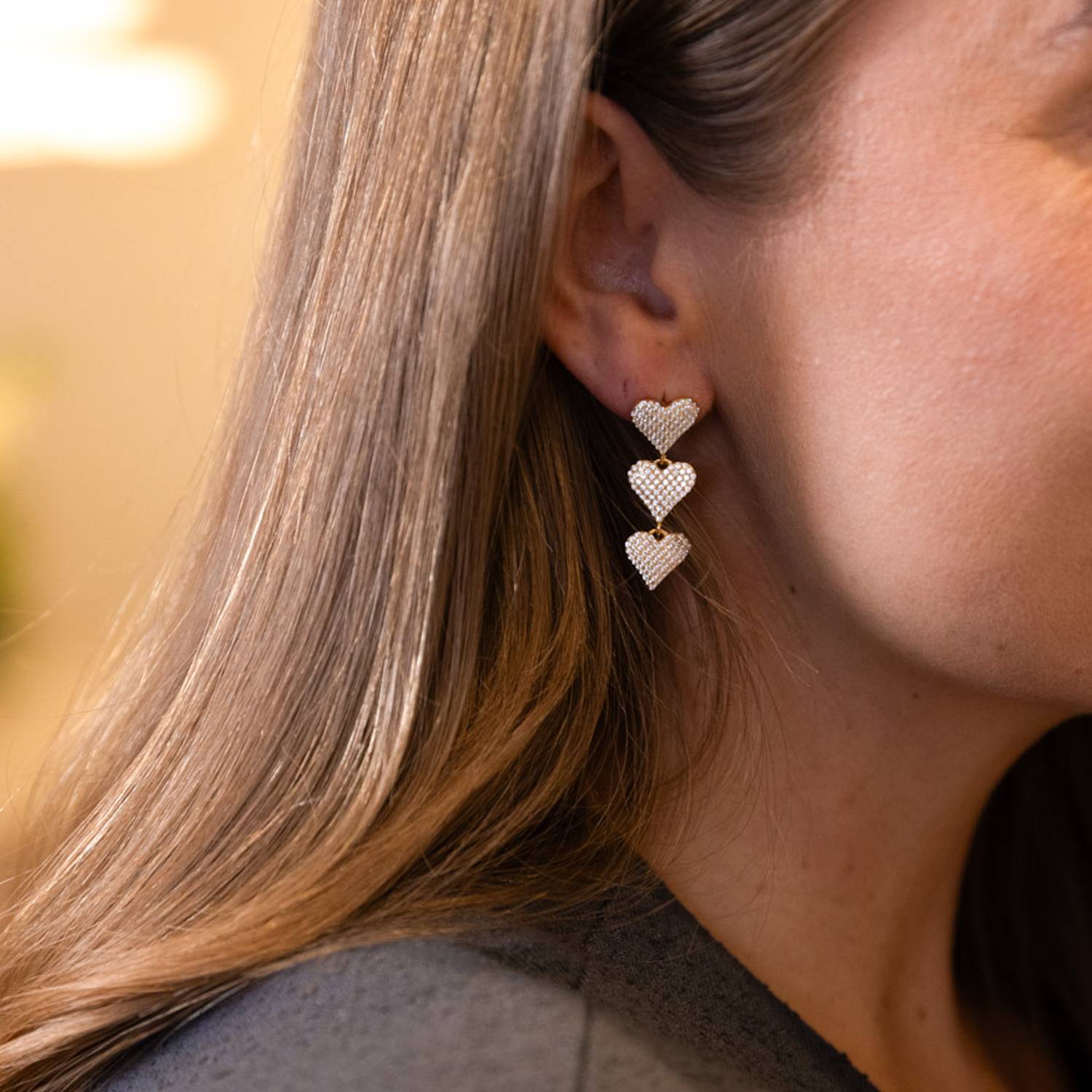 Disse øreringe er designet med tre hjerteformede vedhæng, der hænger i en smuk kaskade. Hvert hjerte er omhyggeligt besat med små, glitrende zirkonia-sten, der fanger lyset fra alle vinkler. Den gyldne nuance af det forgyldte sølv skaber en varm og indbydende glød, der komplementerer enhver hudtone.