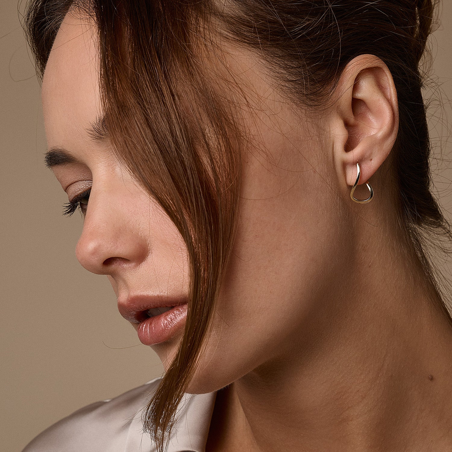 De bløde, flydende linjer i øreringene skaber en følelse af bevægelse og lethed, mens den gyldne farve tilføjer varme og elegance. Den glatte overflade reflekterer lyset smukt, hvilket giver en subtil glød, der fanger opmærksomheden uden at være overvældende.