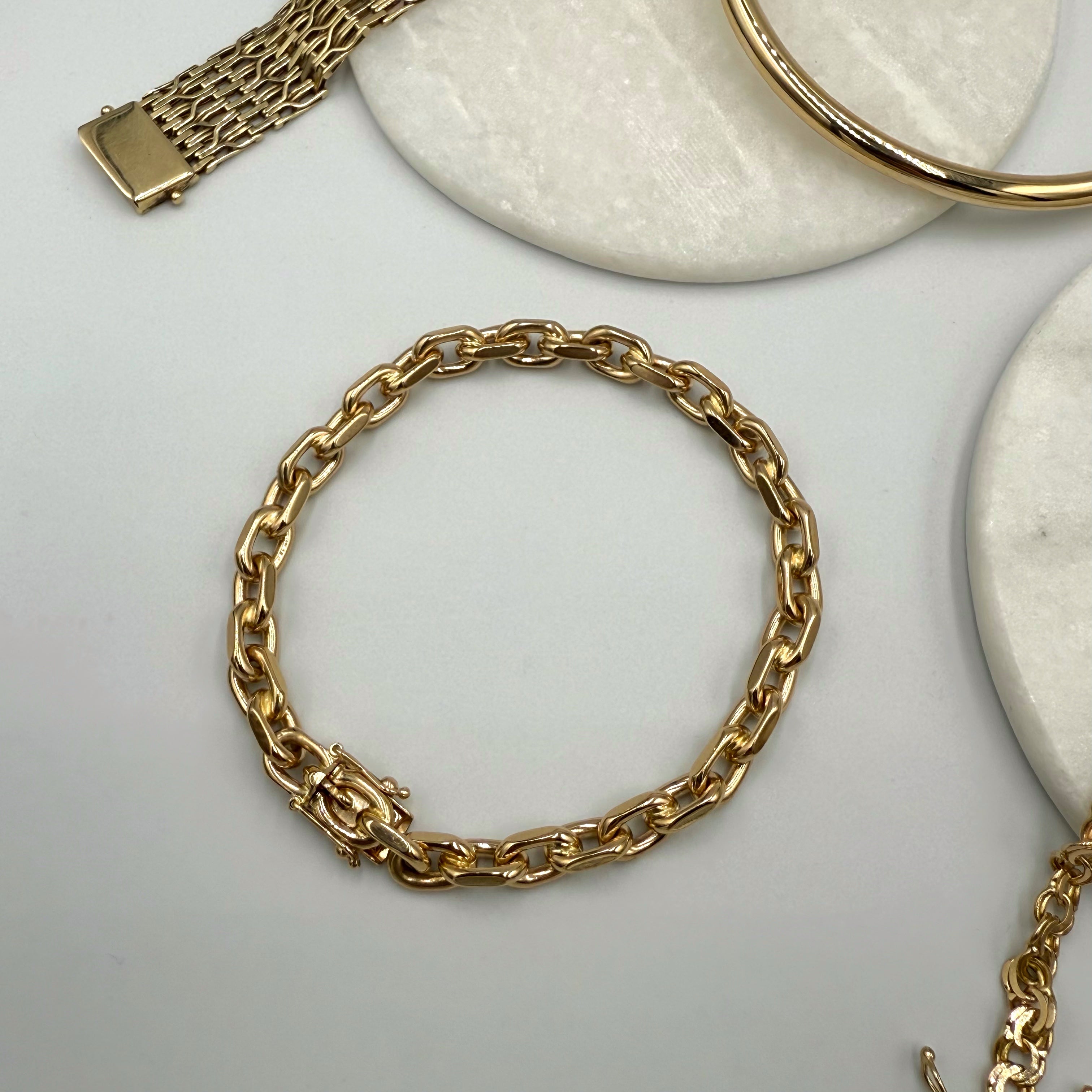 Et tidløst armbånd med klassisk karakter. Dette anker armbånd fra Vibholm ReGold er udført i 14 kt. guld og måler 19 cm. De ovale ankerled skaber en jævn rytme og et harmonisk udtryk, mens den blanke overflade tilføjer glans og enkel elegance. Et alsidigt smykke, der kan bæres alene eller kombineres med andre favoritter.