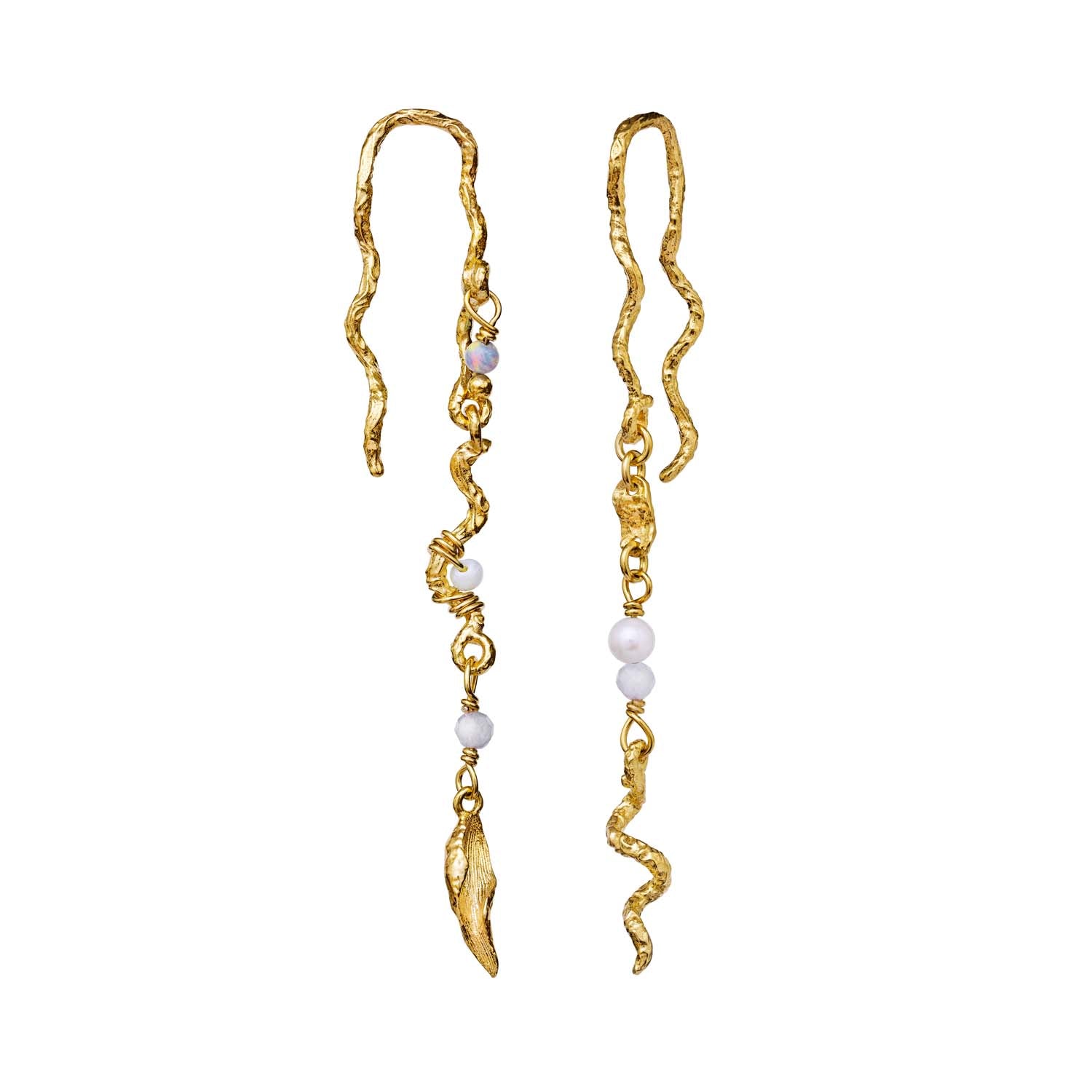 Elisa-øreringene falder fra øret som krøllede, spinkle spirer med små, funklende opaler, akvamariner og ferskvandsperler. Sammen med den gyldne farve danner øreringene et magisk, dragende farvespil, der danser i lyset.